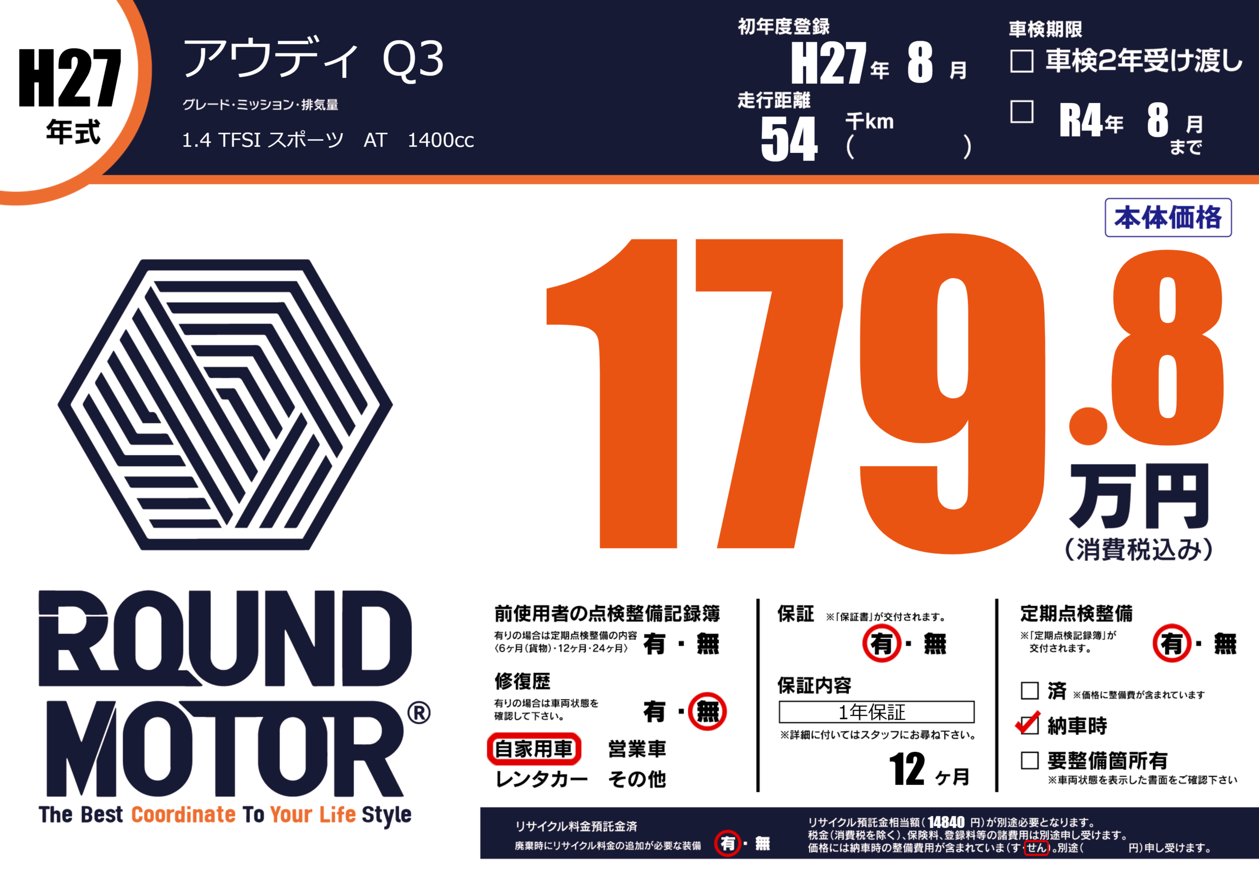 | 車名 | アウディ Q3 | グレード ミッション 排気量 |