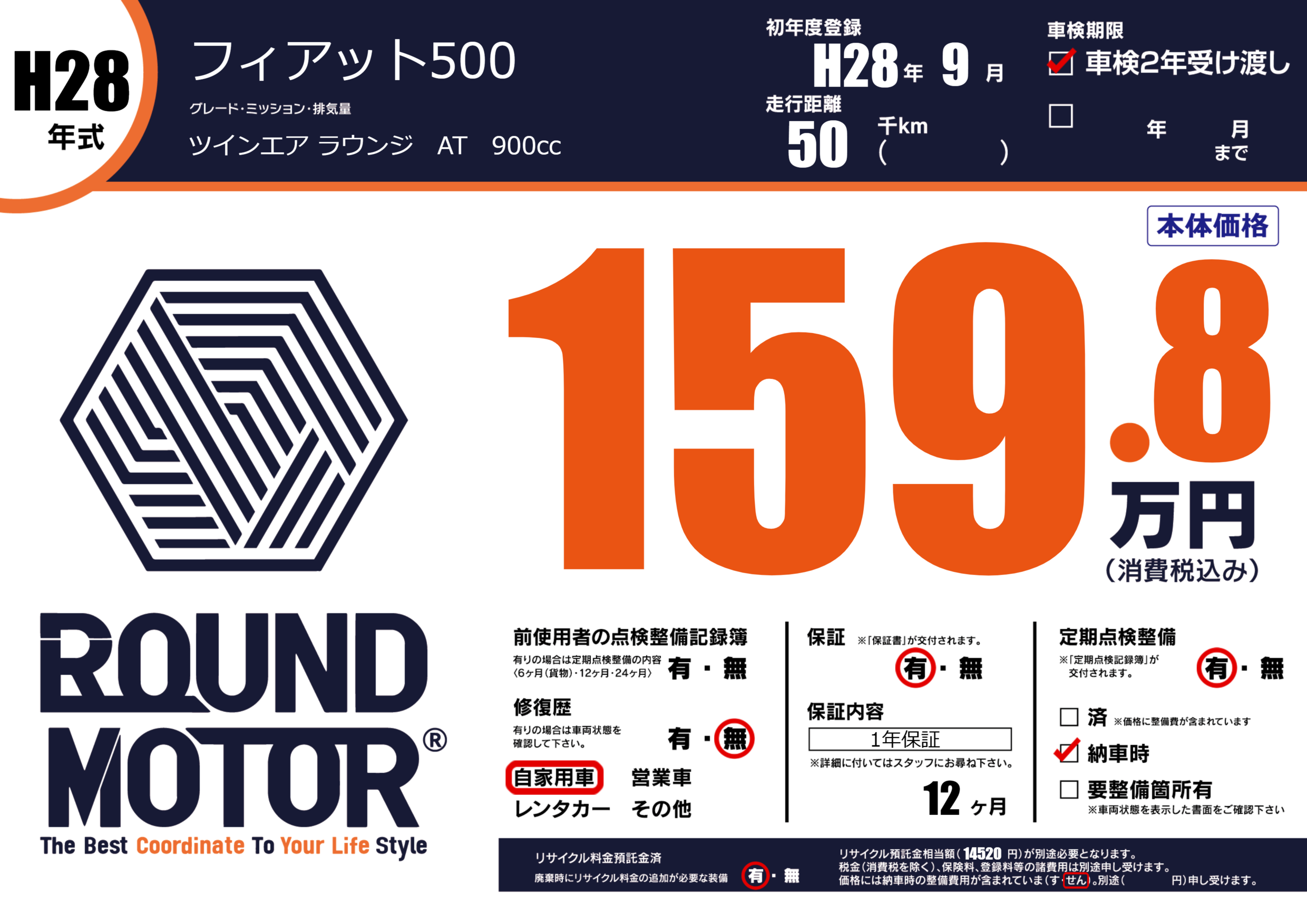 | 車名 | フィアット500 | グレード ミッション 排気量 |