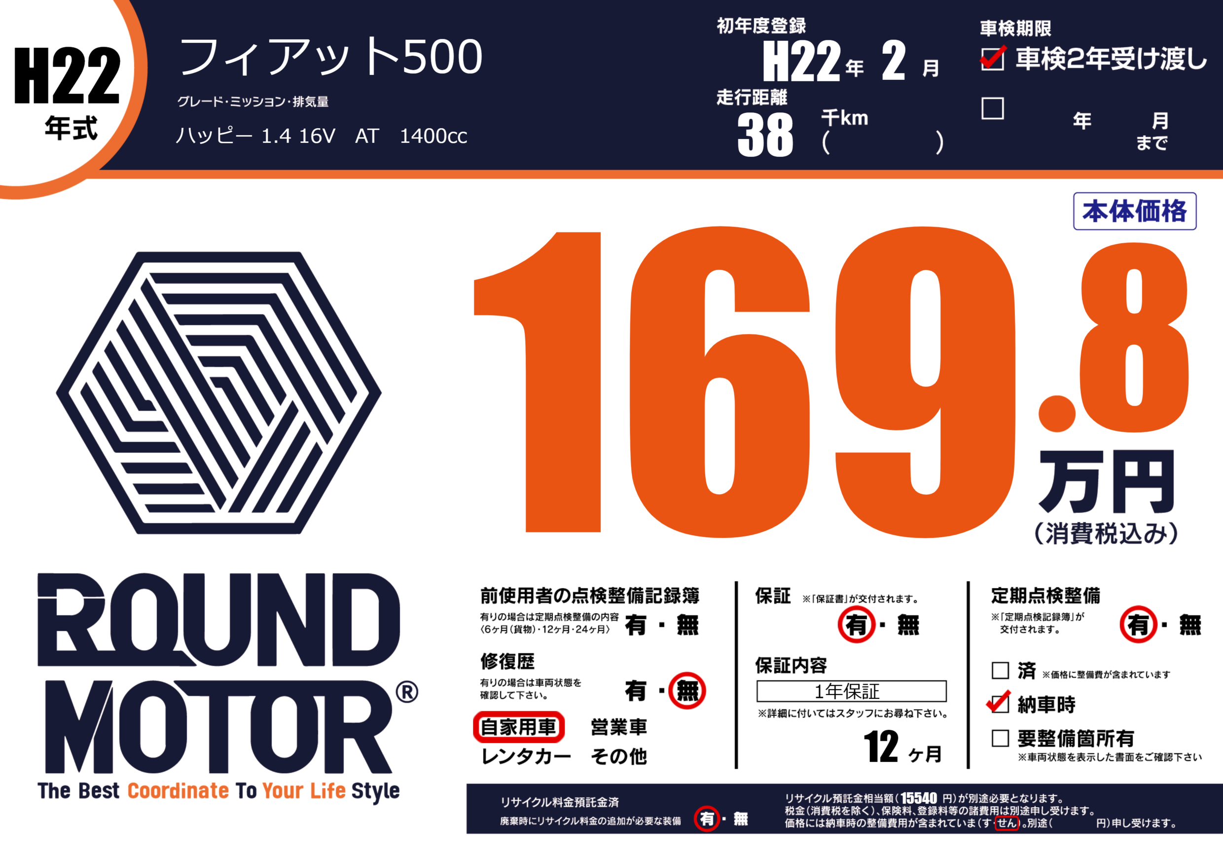 | 車名 | フィアット500 | グレード ミッション 排気量 |