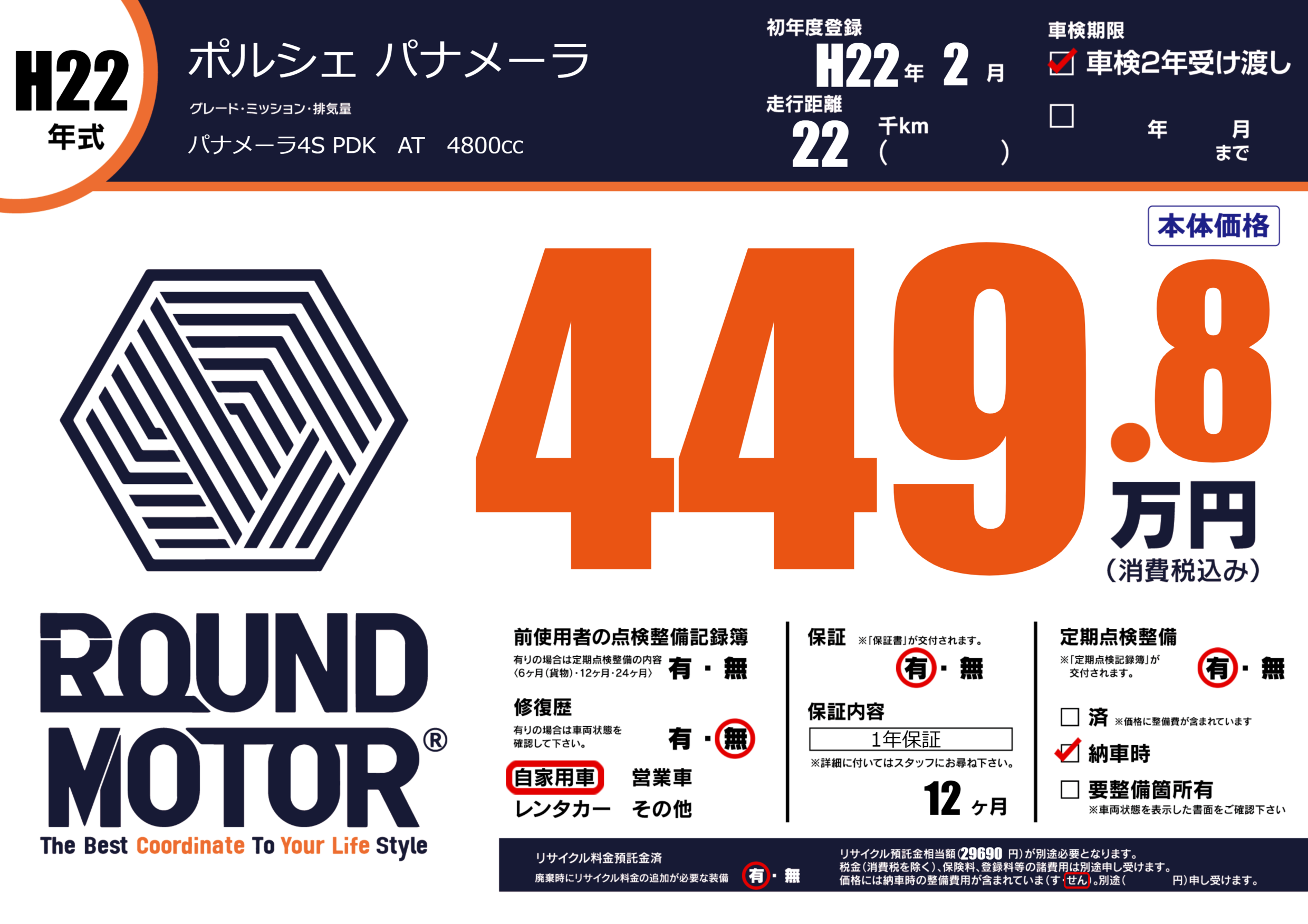 | 走行キロ | 2.2万km | 初年度登録 | H22年2月 |