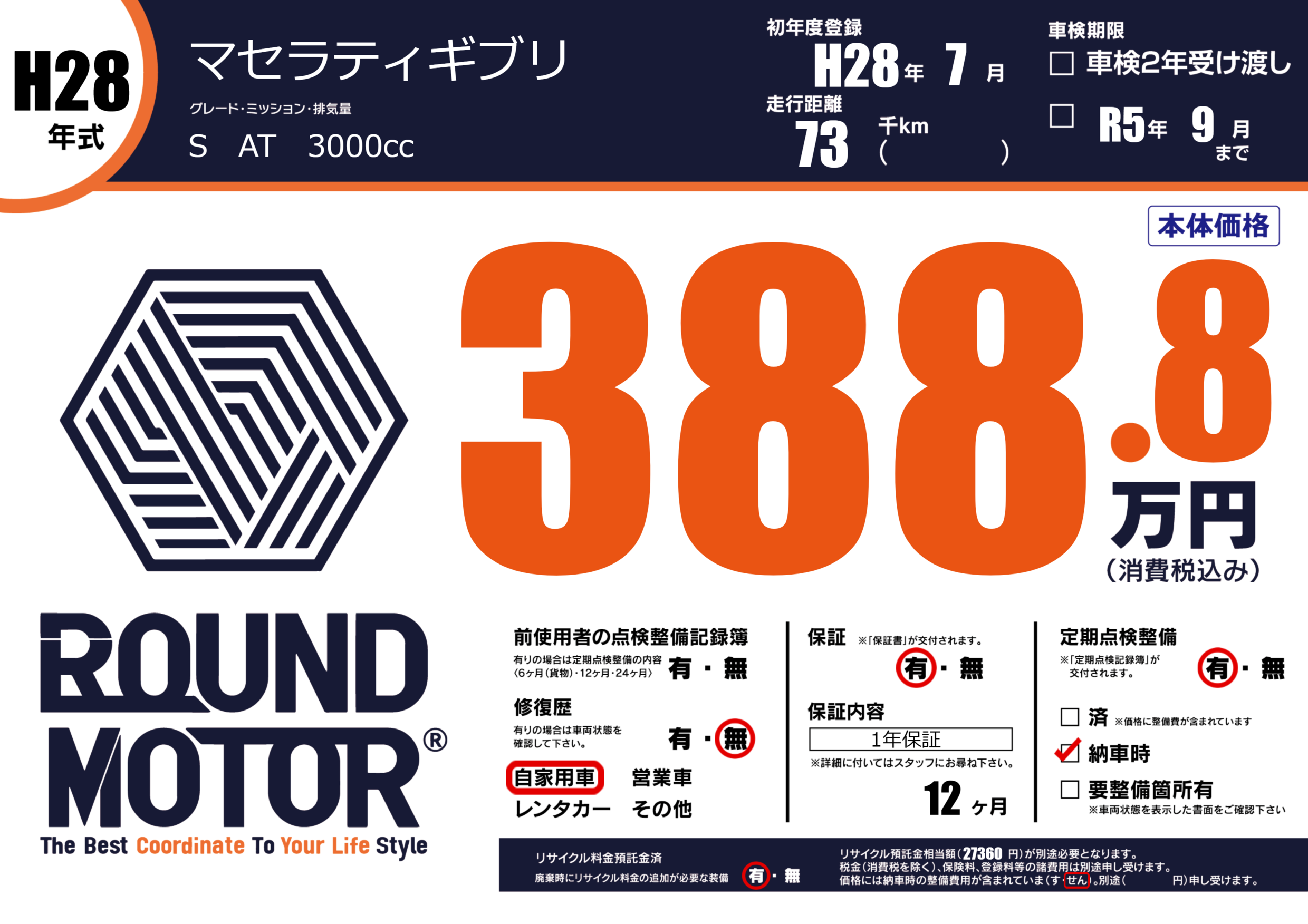 | 車名 | マセラティギブリ | グレード ミッション 排気量 |