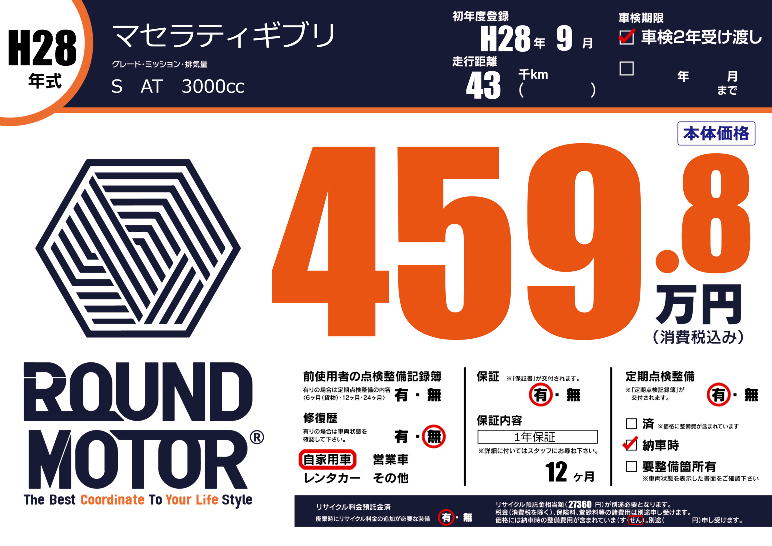 | 車名 | マセラティギブリ | グレード ミッション 排気量 |