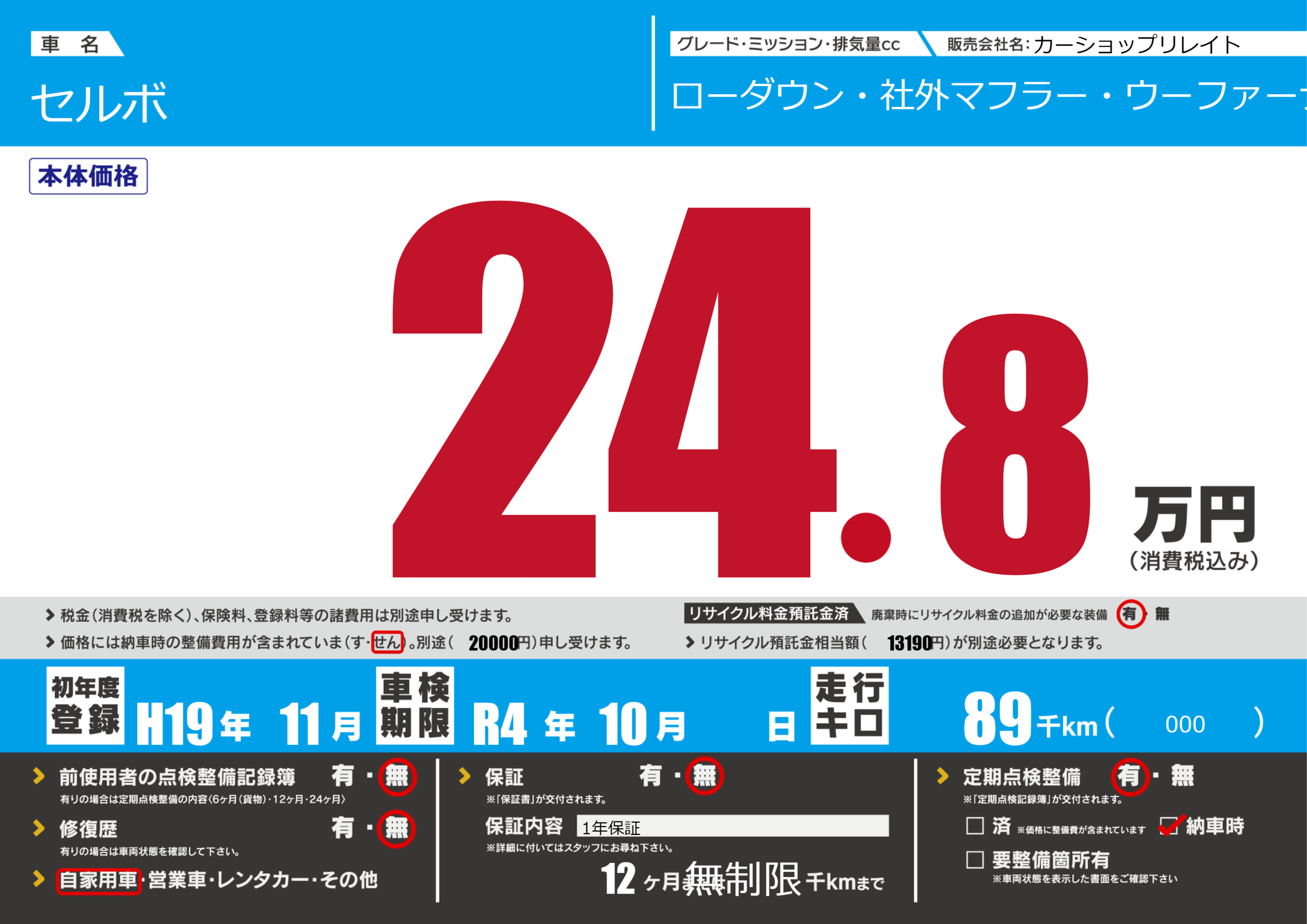 | 車検制限 | R4年 10月 - 日 | ||