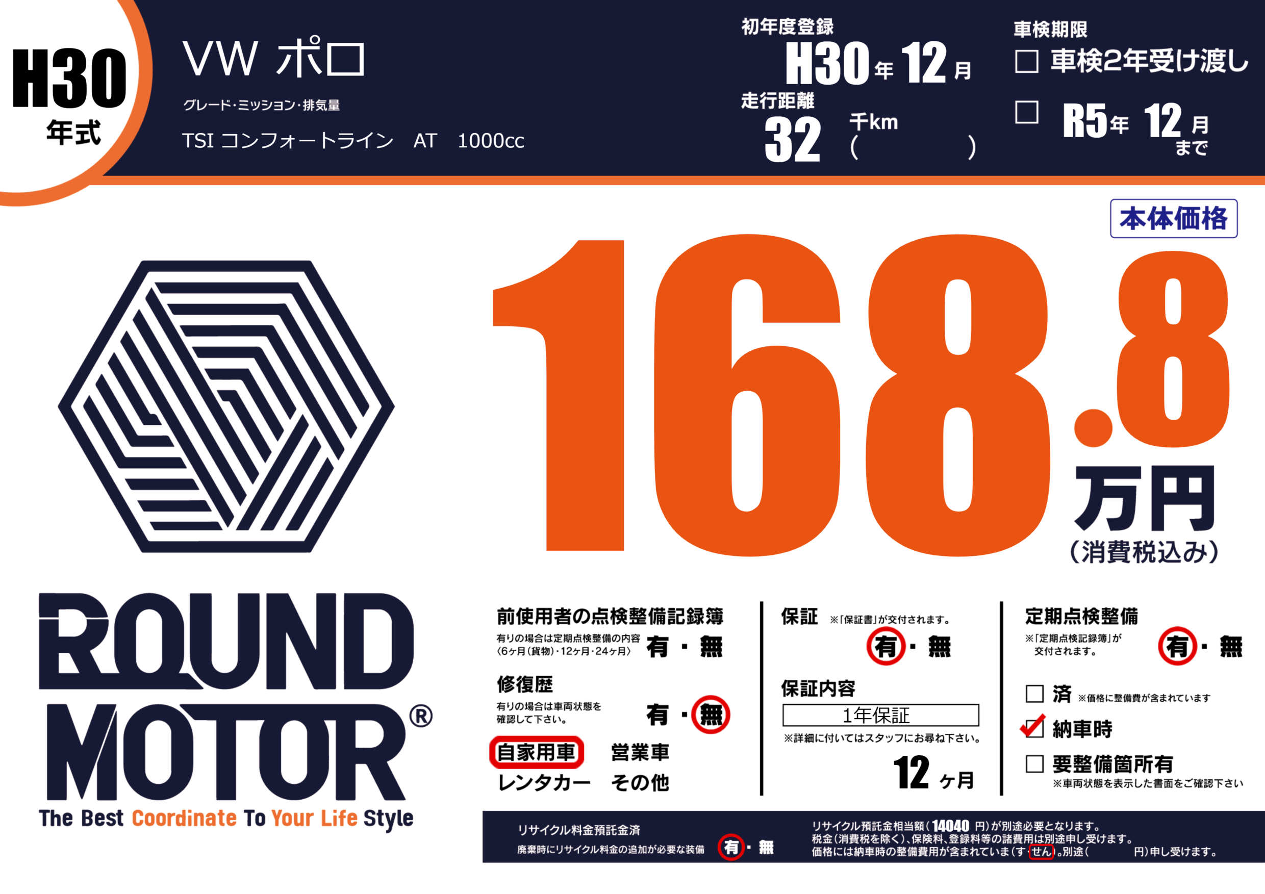 | 車名 | VW ポロ | グレード ミッション 排気量 |