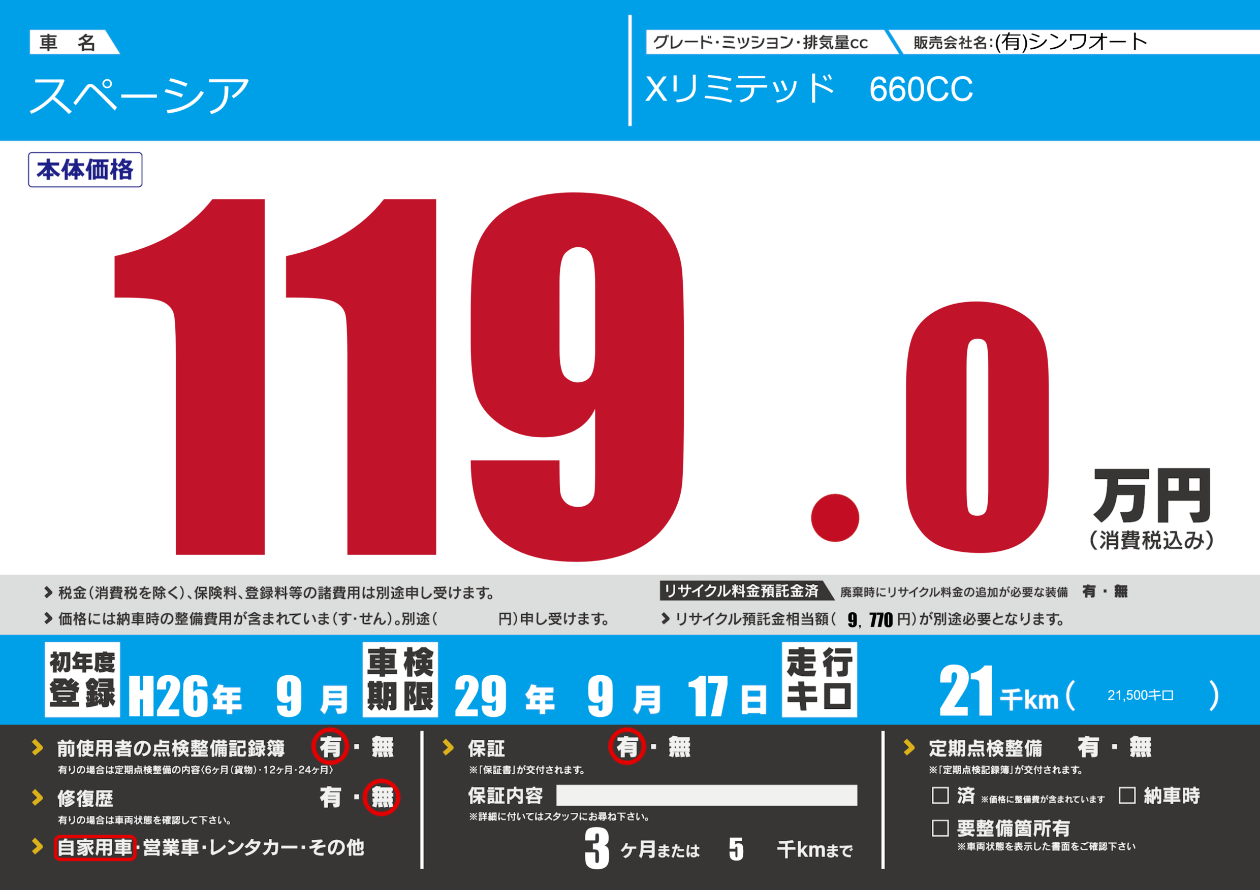| 車名 | スペーシア | グレード ミッション 排気量 |