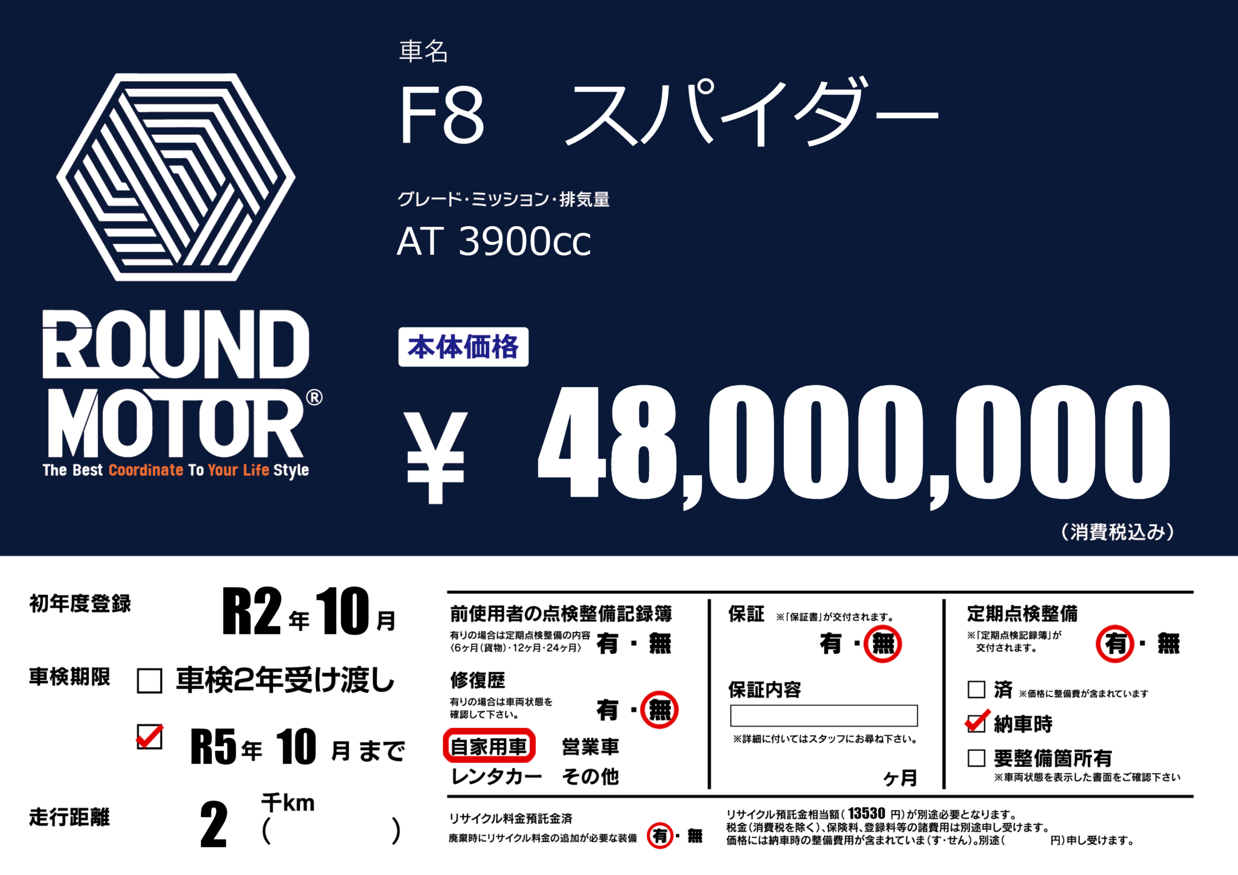 | 車名 | F8 スパイダー | グレード ミッション 排気量 |