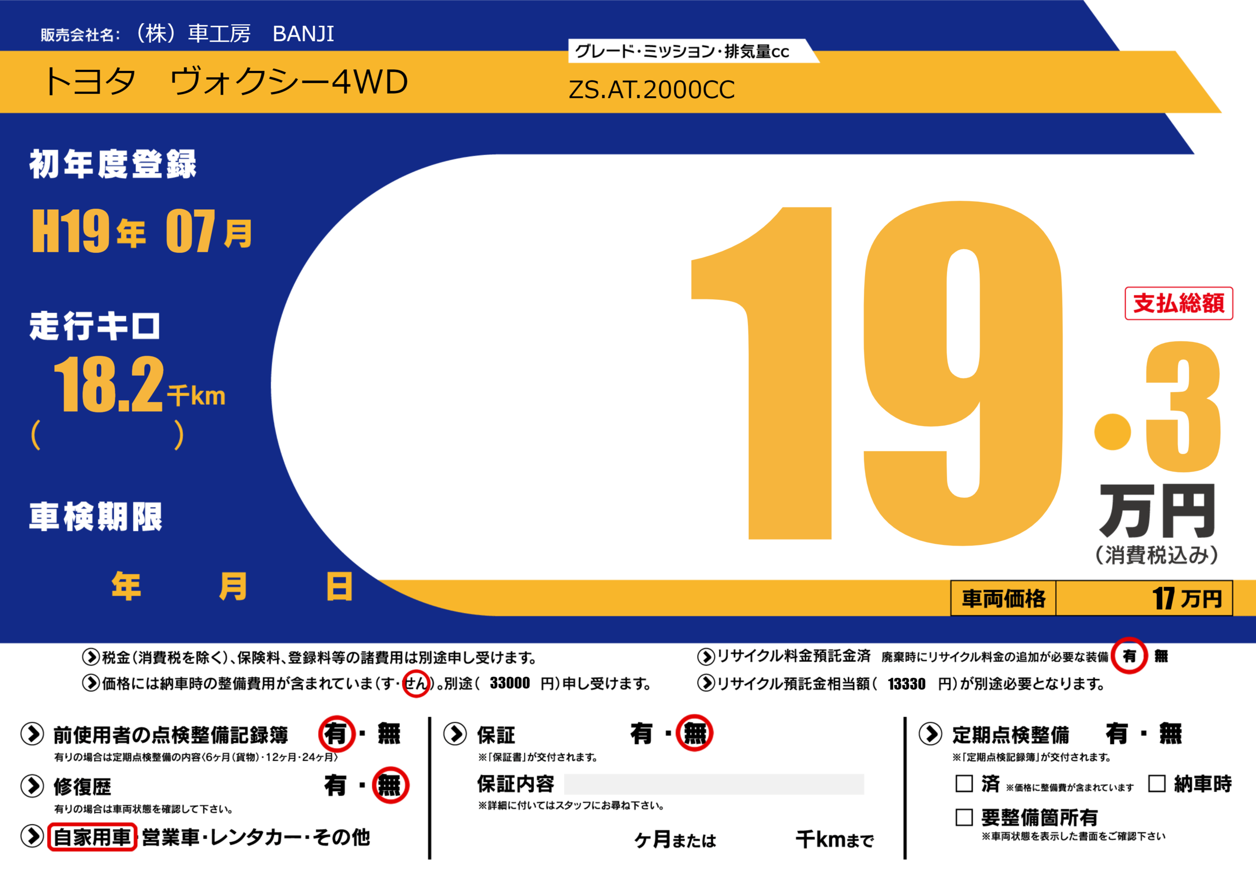 | 車名 | トヨタ ヴォクシー4WD | グレード ミッション 排気量 |