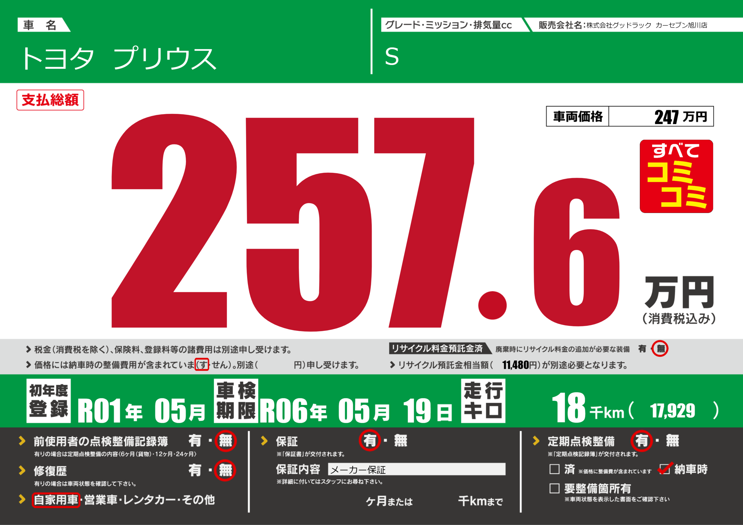 | 車名 | トヨタ プリウス | グレード ミッション 排気量 |