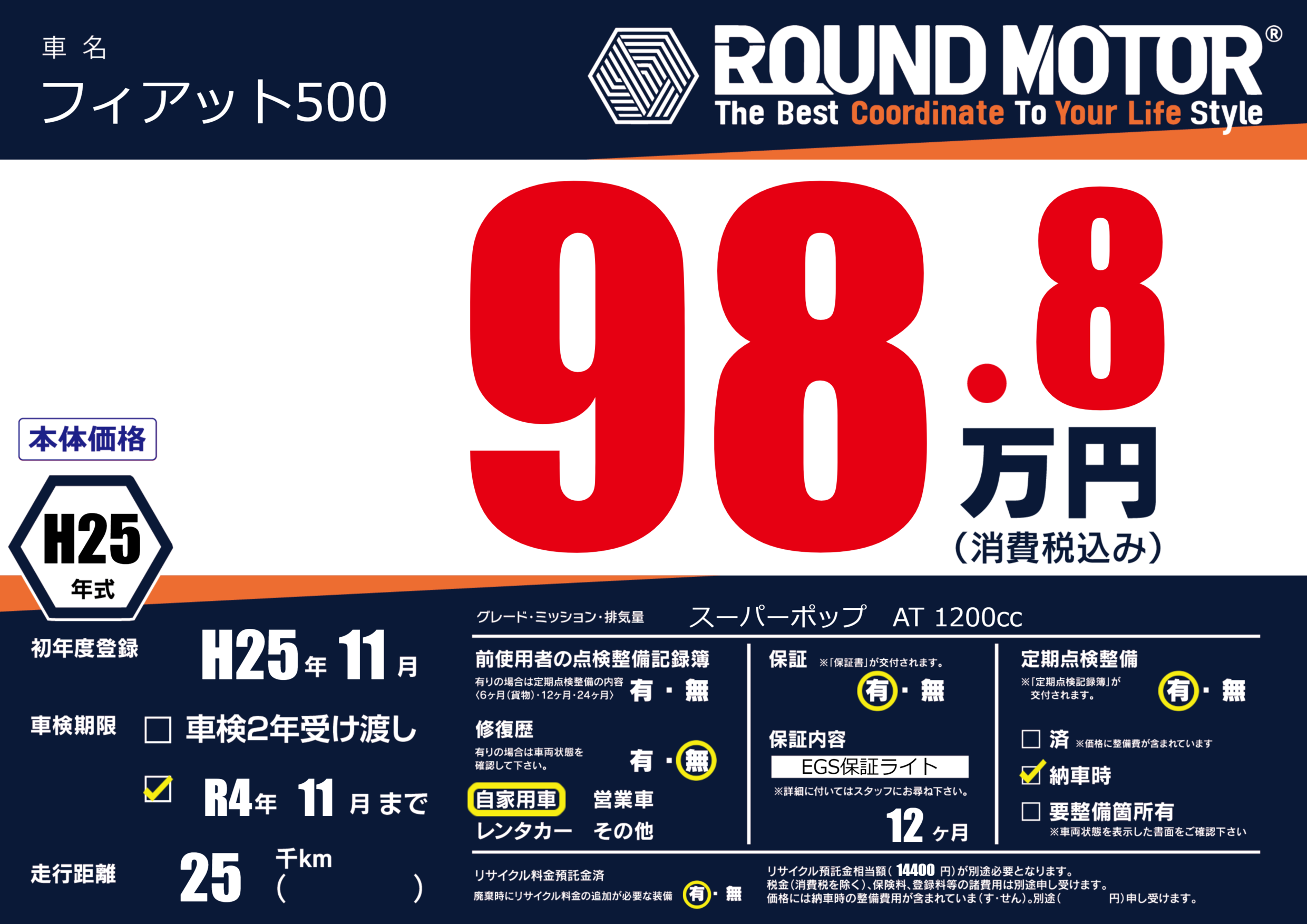 | 車名 | フィアット500 | グレード ミッション 排気量 |