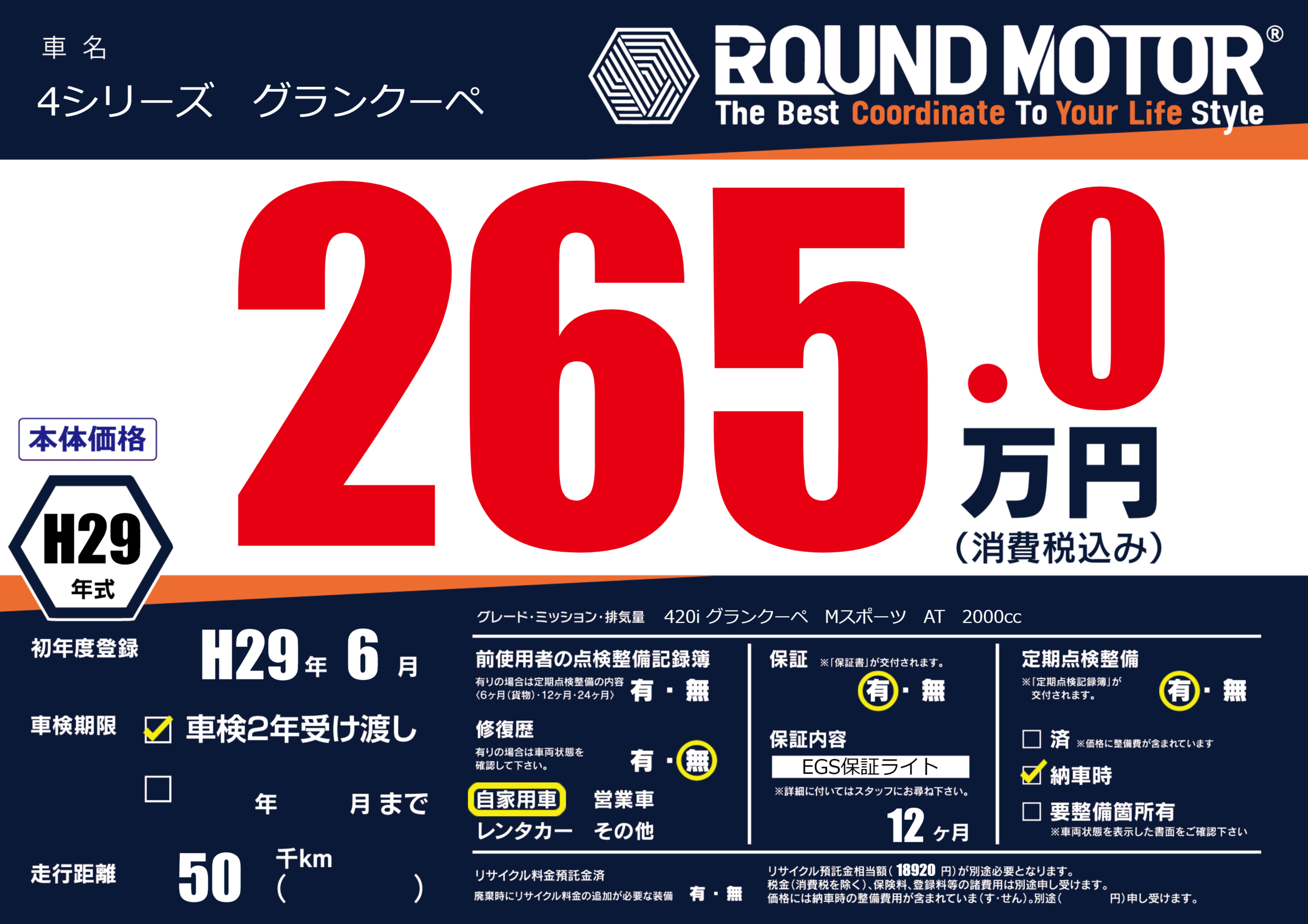 | 走行キロ | 5万km | 初年度登録 | H29年6月 |