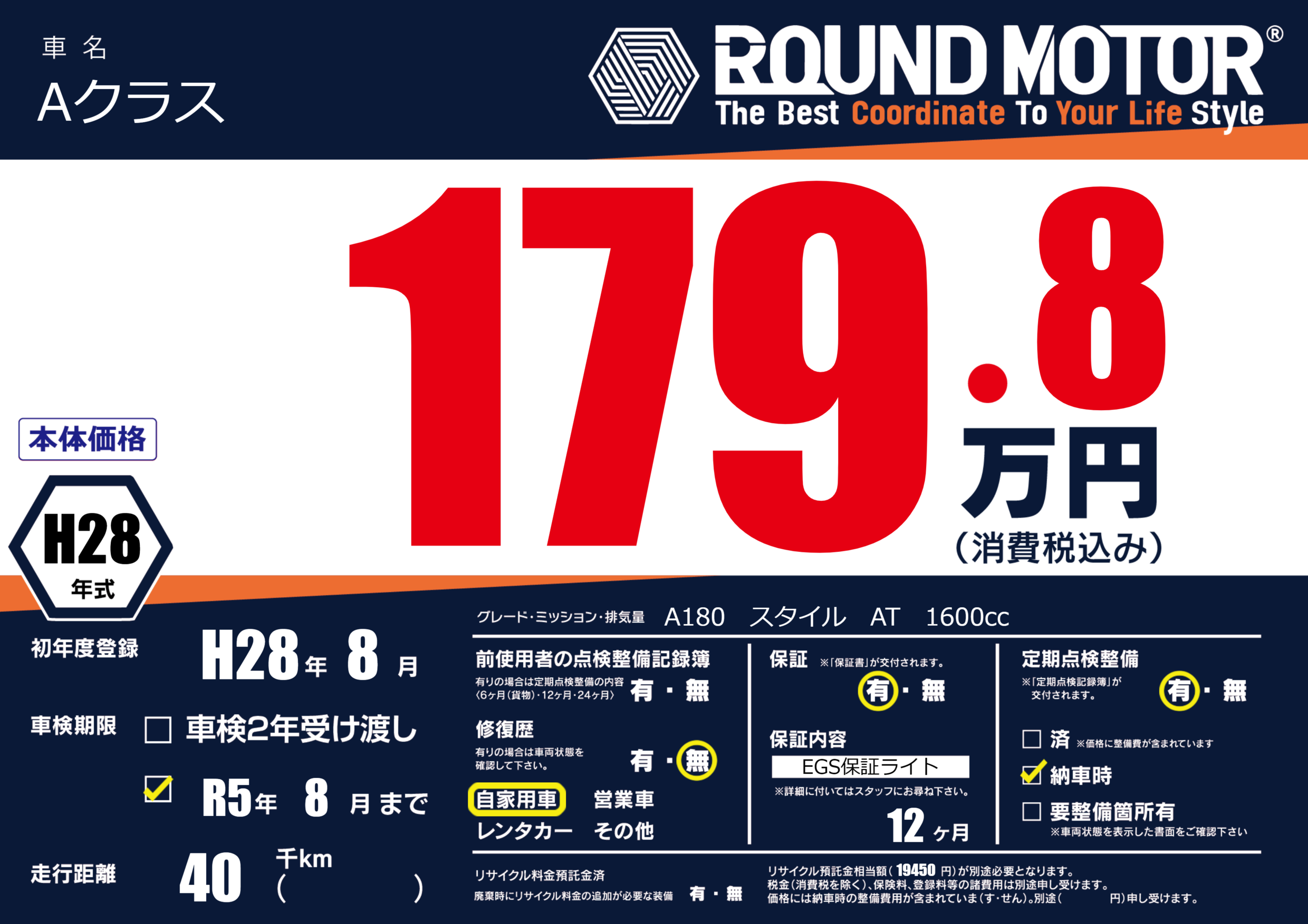 | 走行キロ | 4万km | 初年度登録 | H28年8月 |