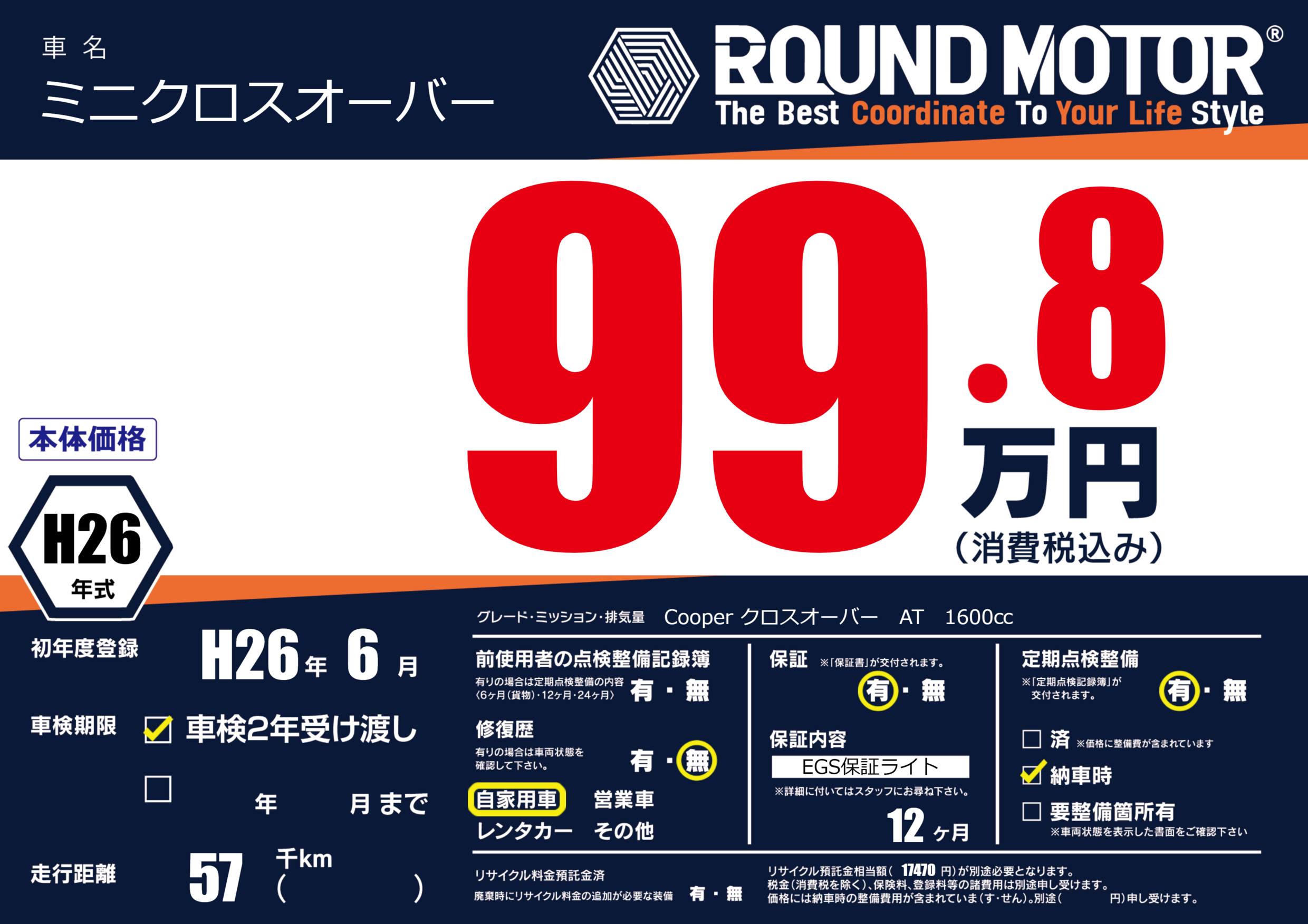 保証付き 保証内容(EGS保証ライト) 12ヶ月または()千kmまで |