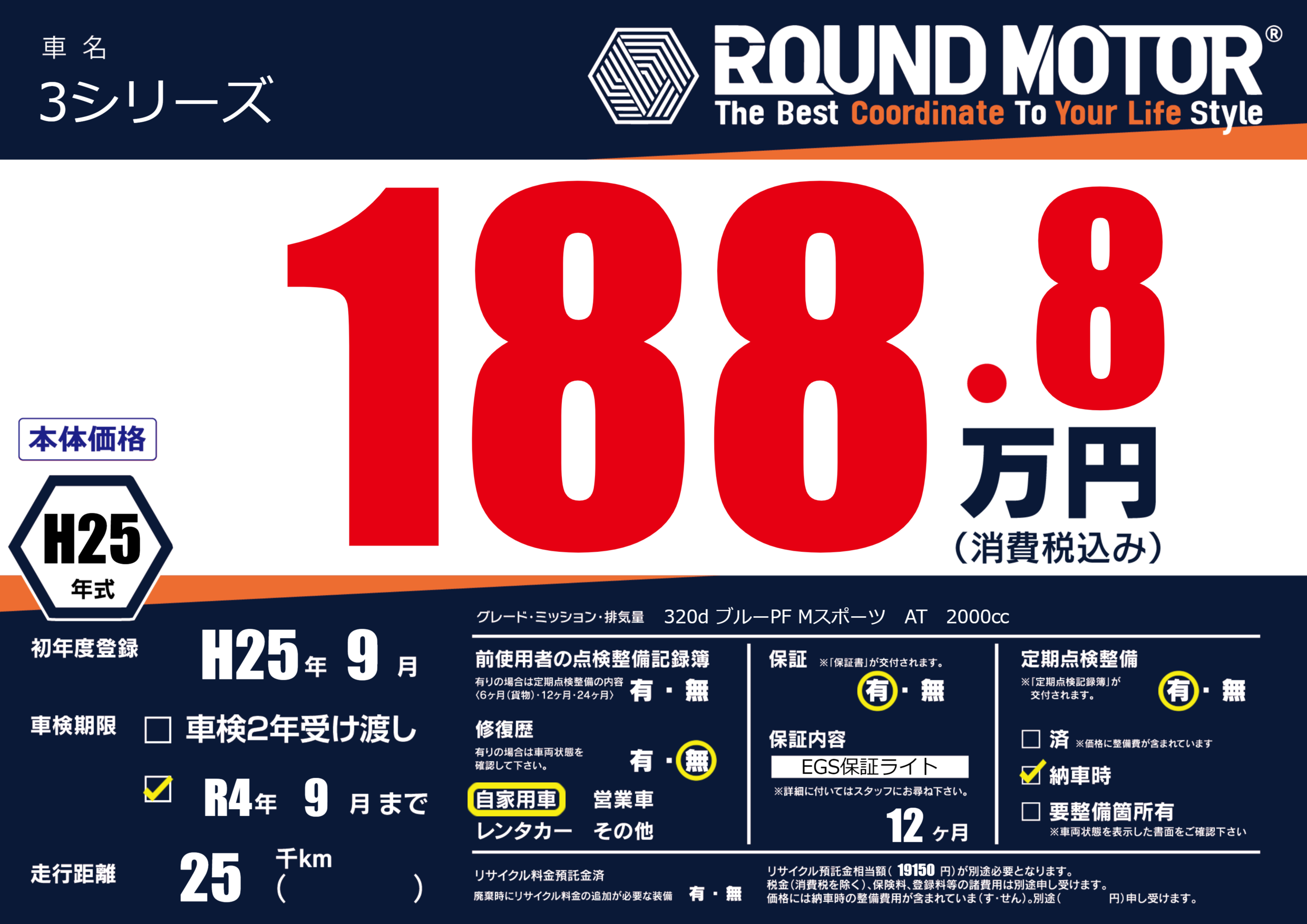 | 走行キロ | 2.5万km | 初年度登録 | H25年9月 |