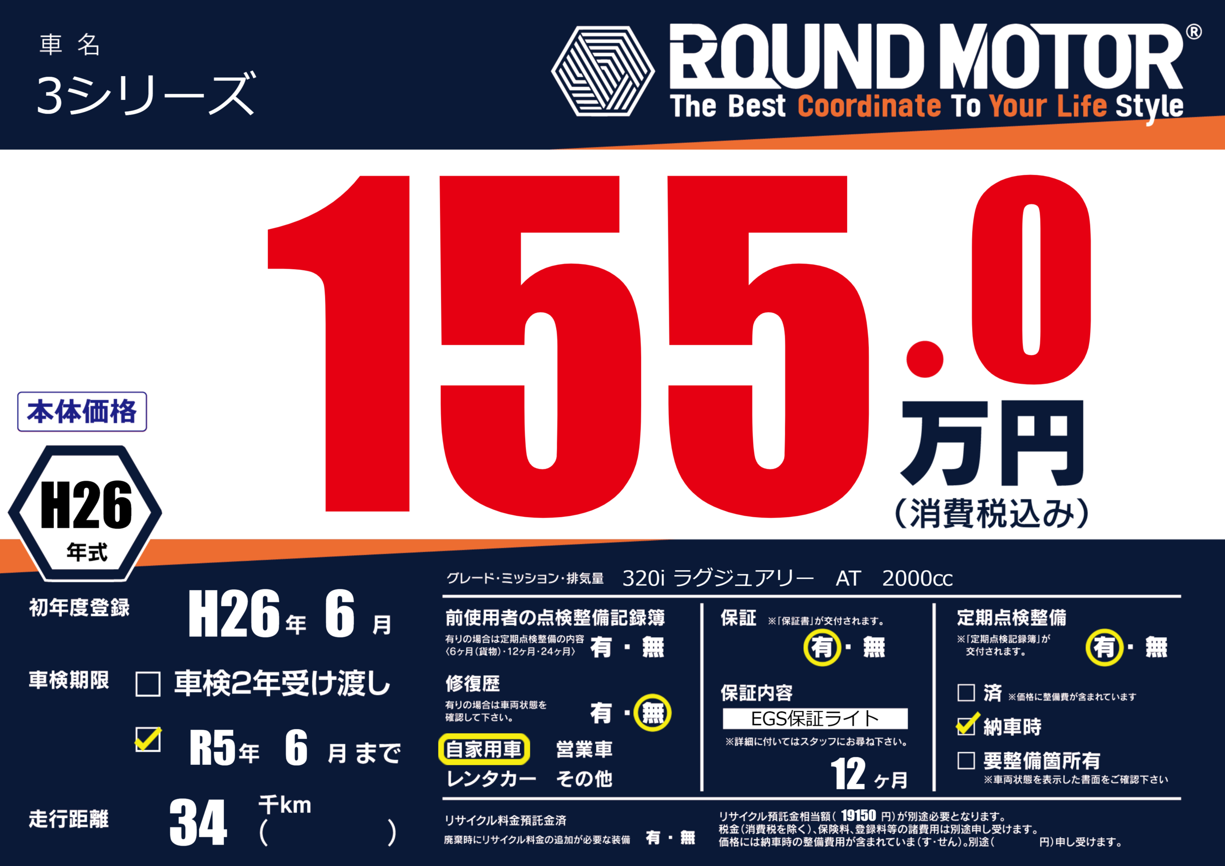 | 走行キロ | 3.4万km | 初年度登録 | H26年6月 |