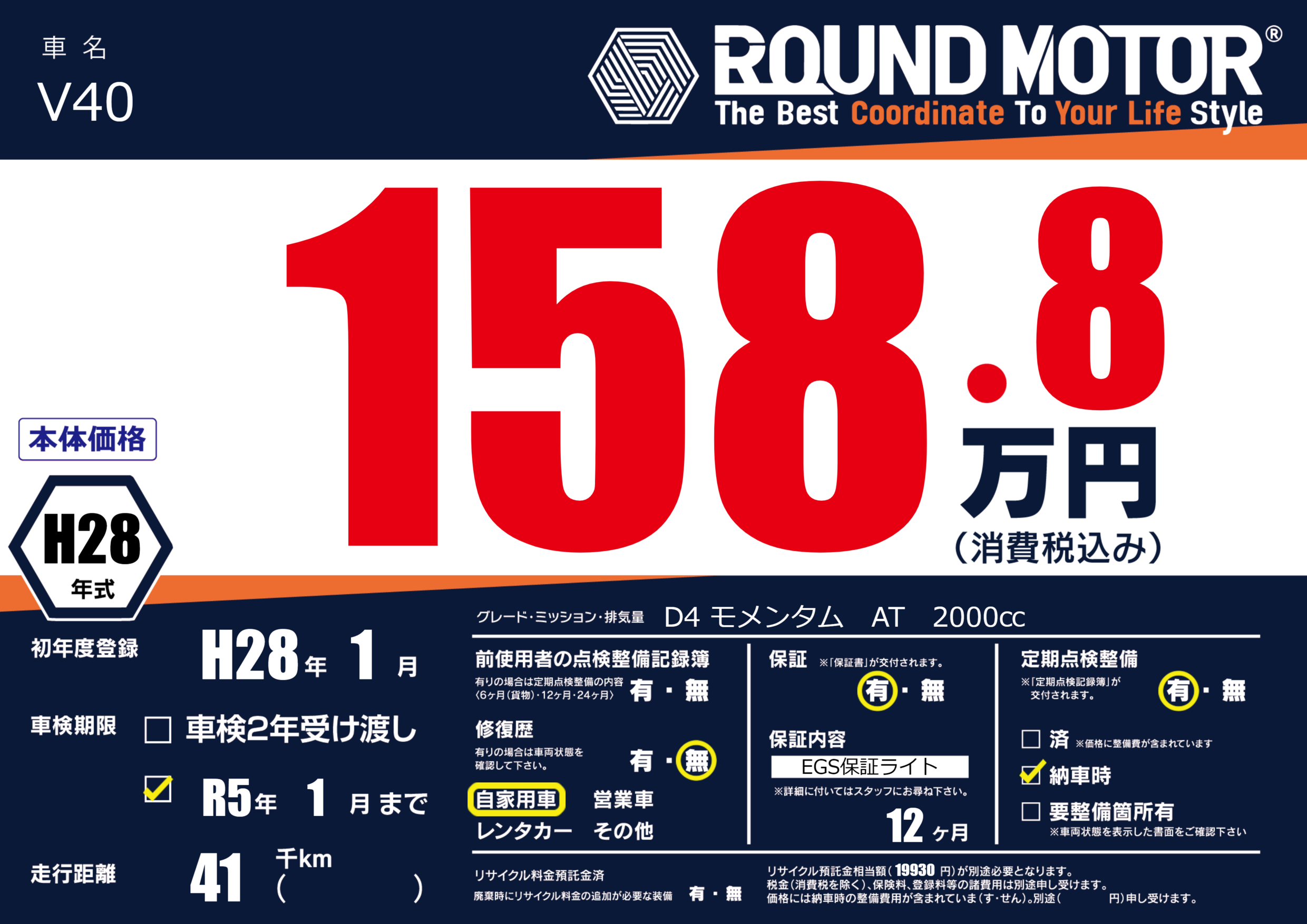 | 走行キロ | 4.1万km | 初年度登録 | H28年1月 |