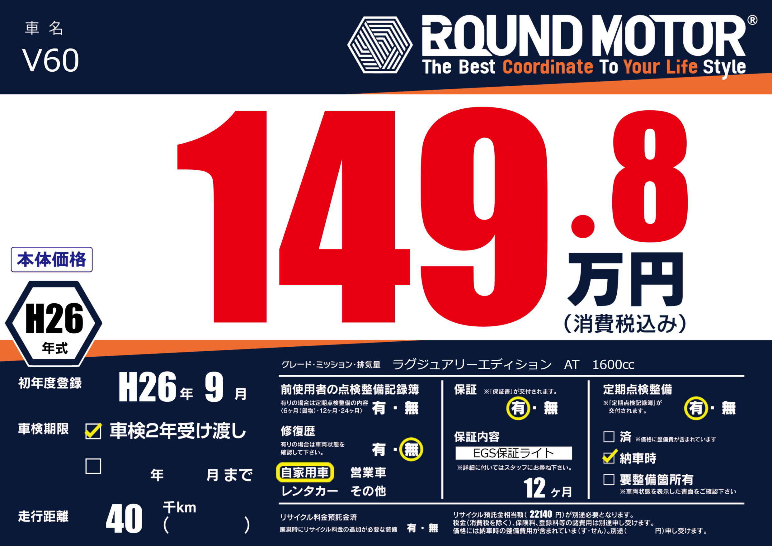 | 走行キロ | 4万km | 初年度登録 | H26年9月 |