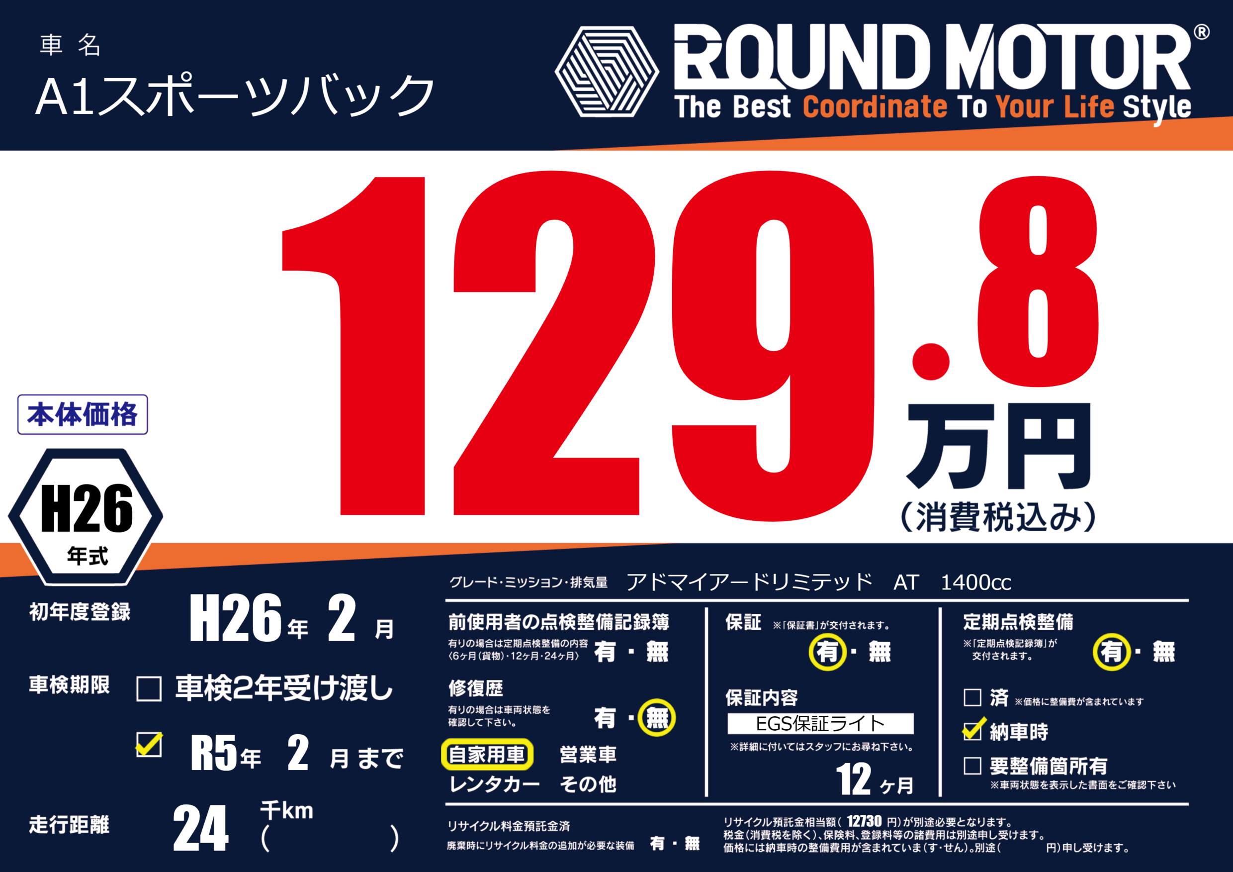 | 車名 | A1スポーツバック | グレード ミッション 排気量 |
