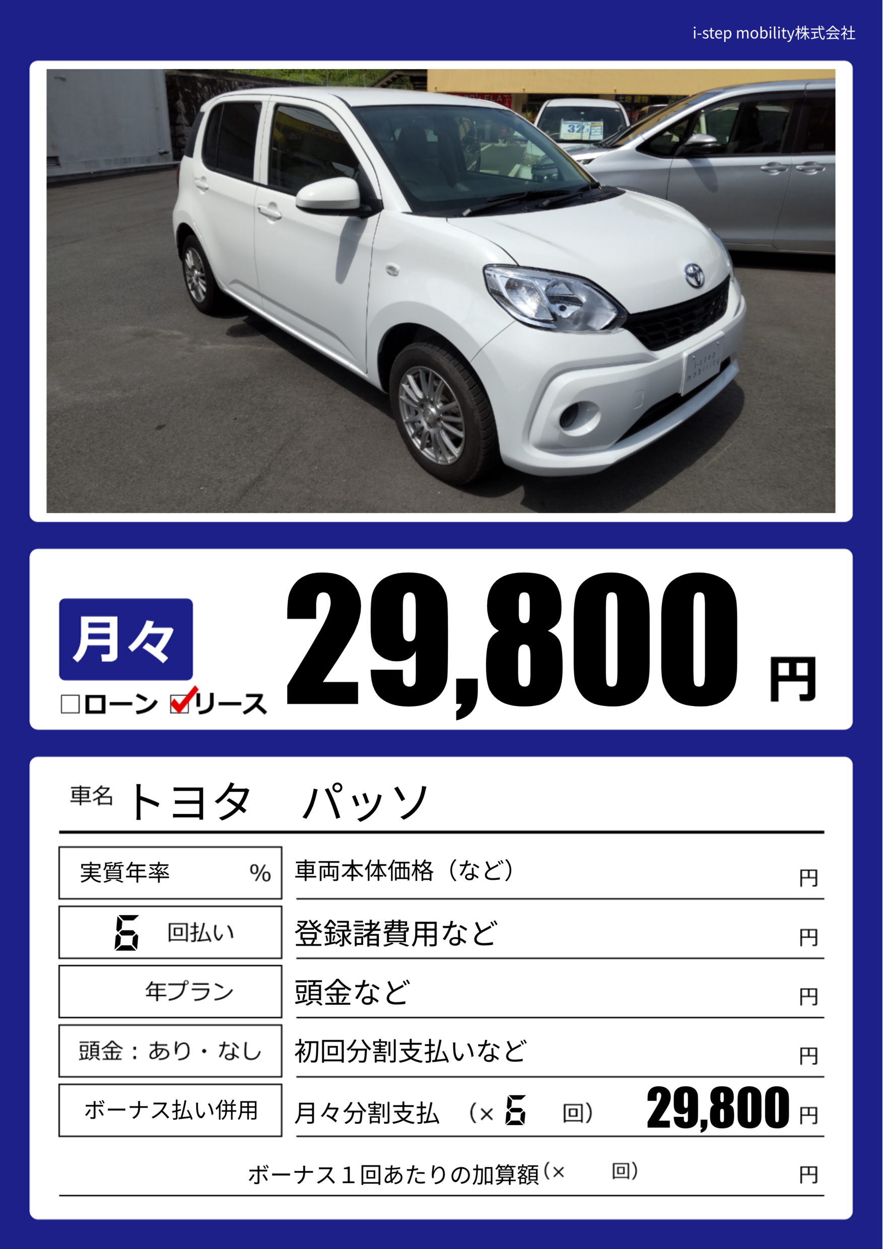 | 車名 | トヨタ パッソ | グレード ミッション 排気量 |