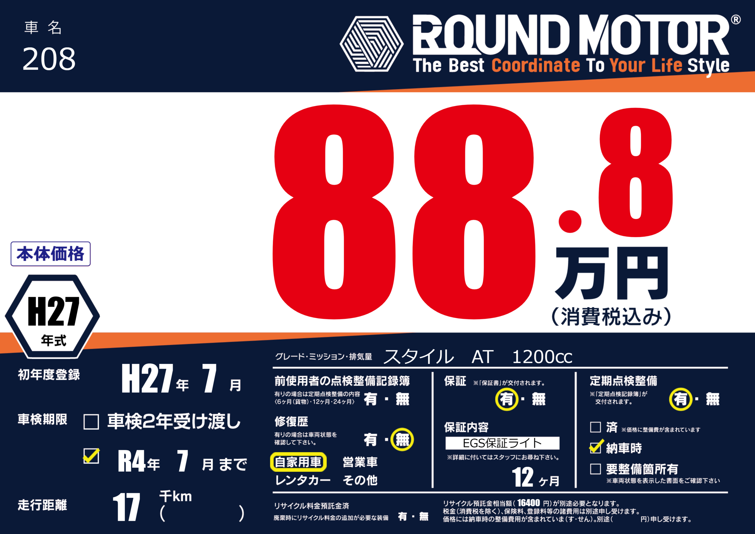 | 走行キロ | 1.7万km | 初年度登録 | H27年7月 |