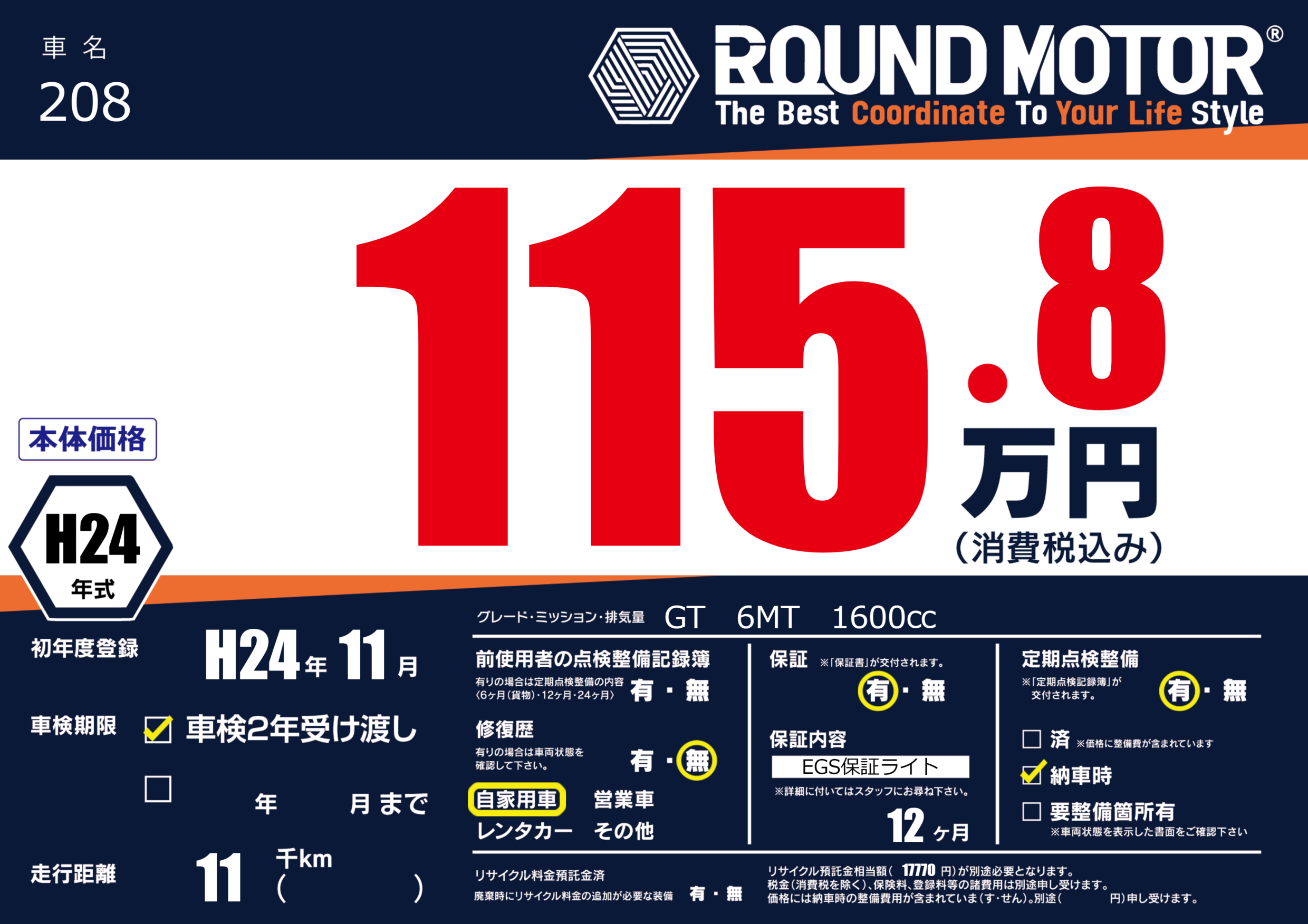 保証付き 保証内容(EGS保証ライト) 12ヶ月または()千kmまで |