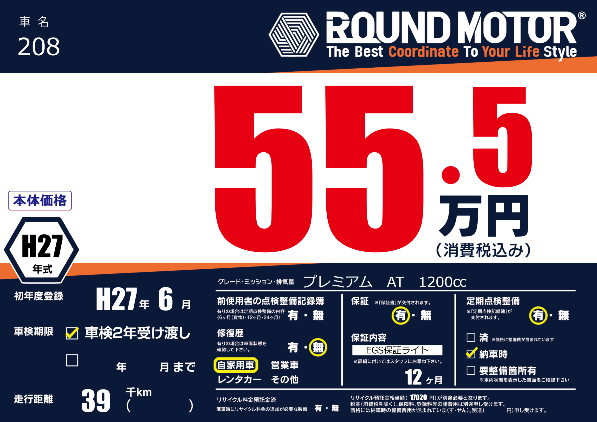| 走行キロ | 3.9万km | 初年度登録 | H27年6月 |