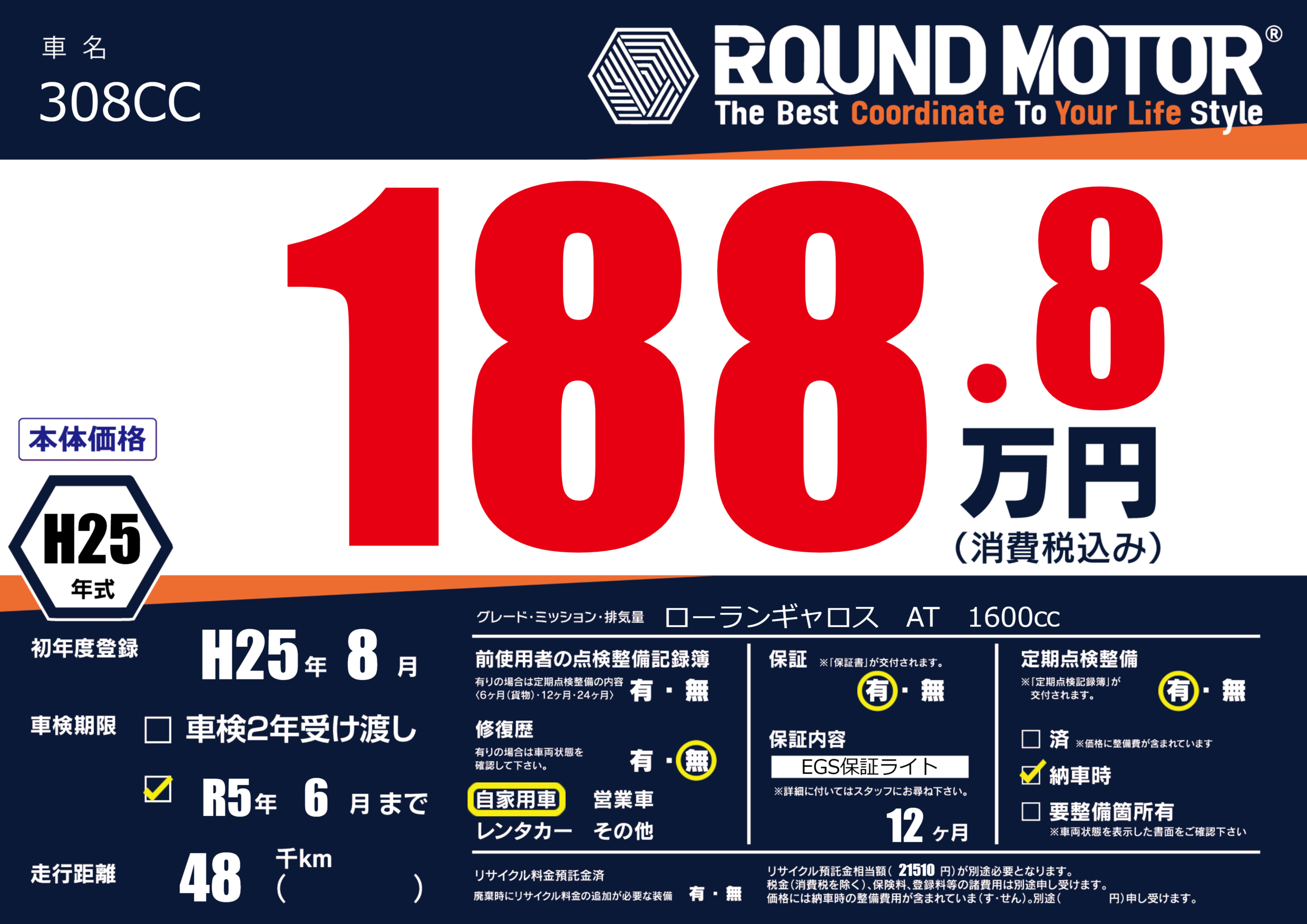 | 車名 | 308CC | グレード ミッション 排気量 |