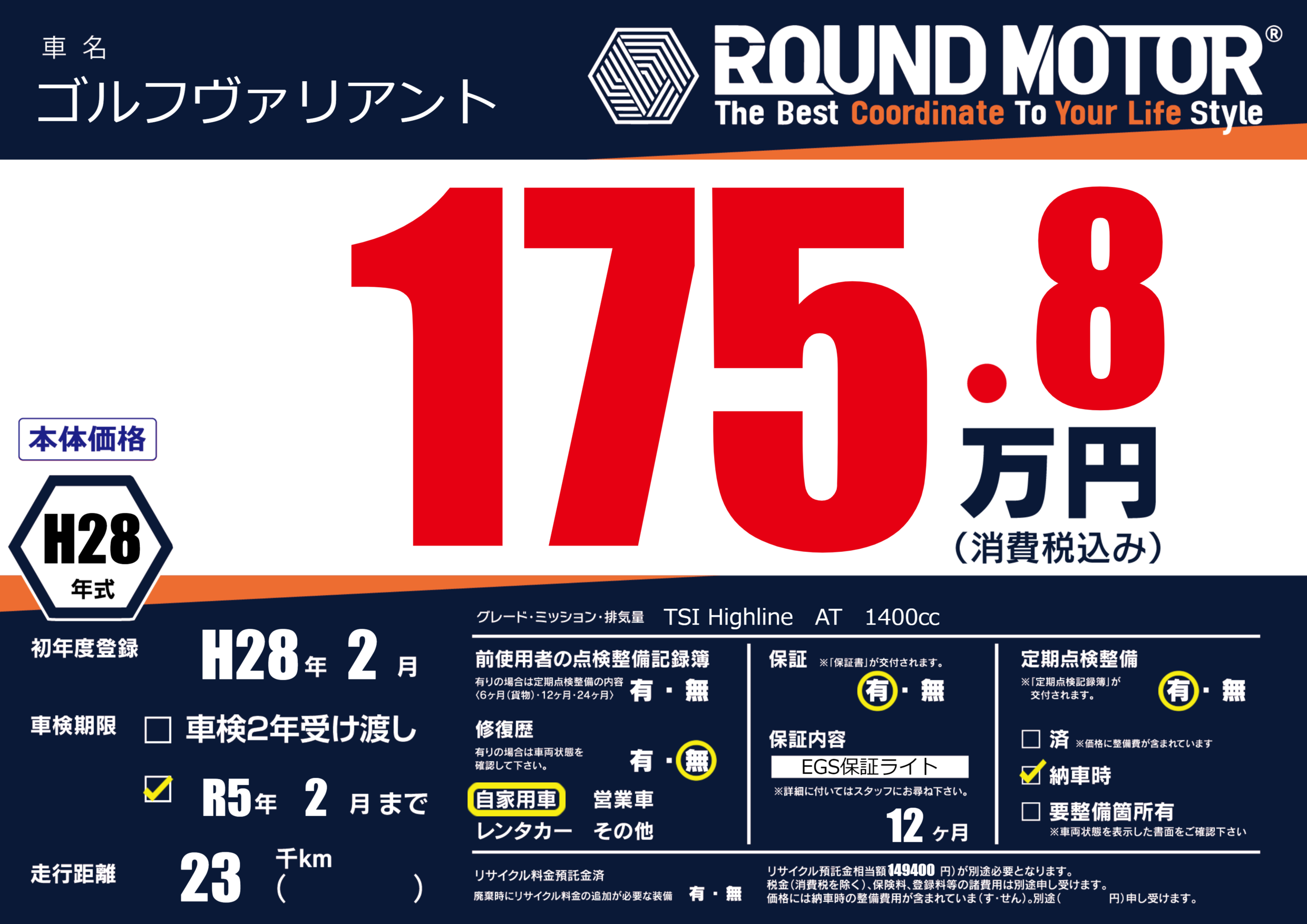 | 車名 | ゴルフヴァリアント | グレード ミッション 排気量 |