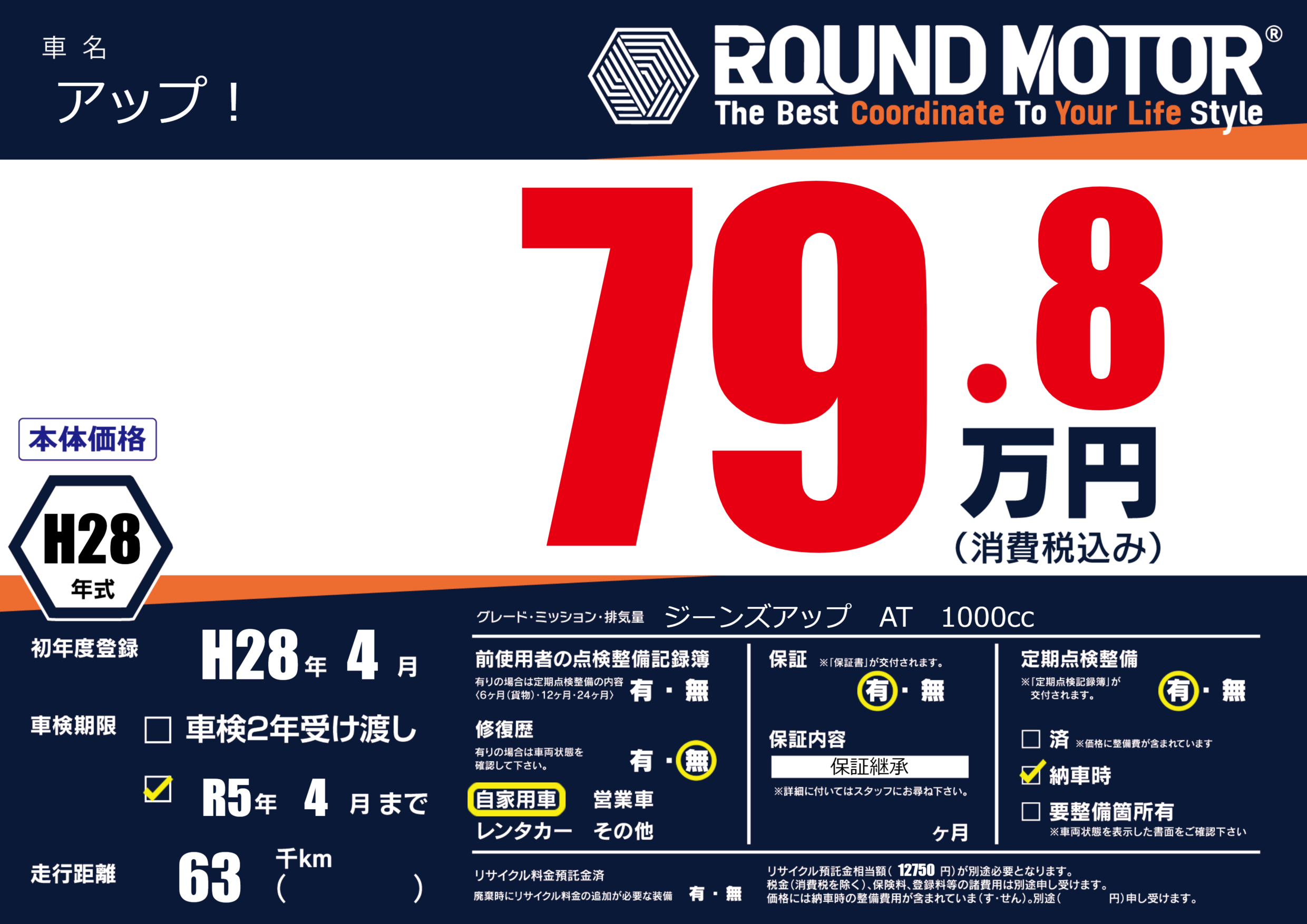 | 車名 | アップ! | グレード ミッション 排気量 |