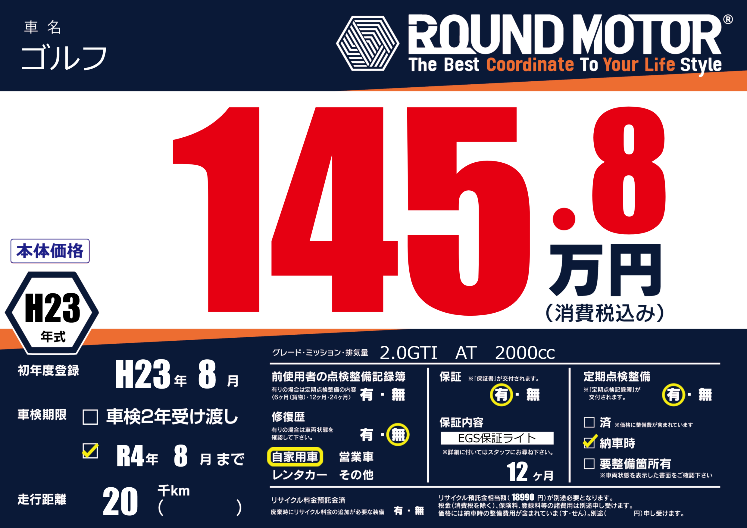 | 車名 | ゴルフ | グレード ミッション 排気量 |