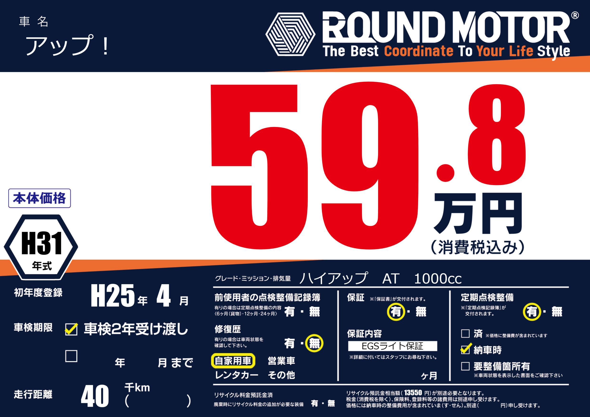 保証付き 保証内容(EGSライト保証) ---ヶ月または()千kmまで |