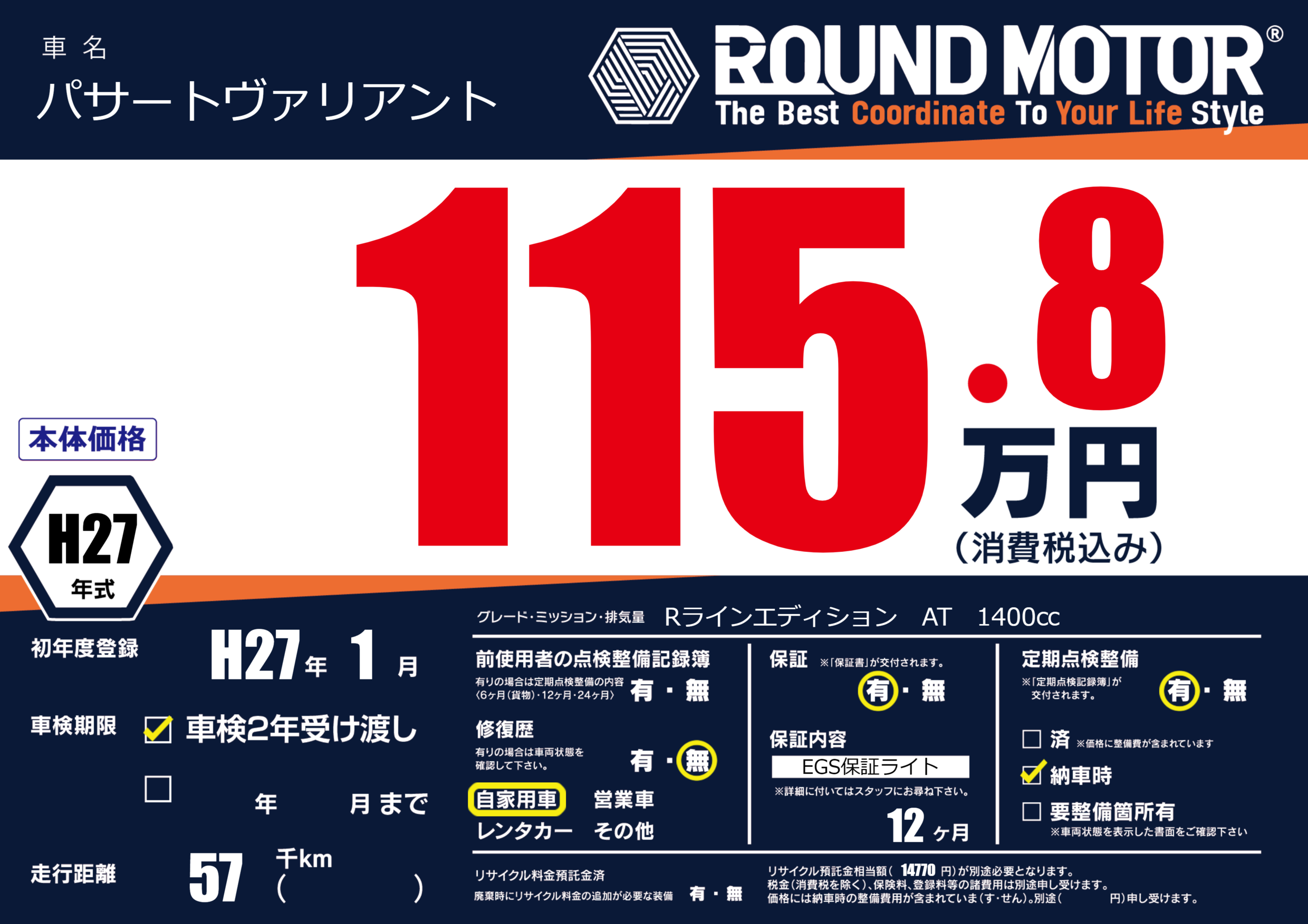 | 走行キロ | 5.7万km | 初年度登録 | H27年1月 |