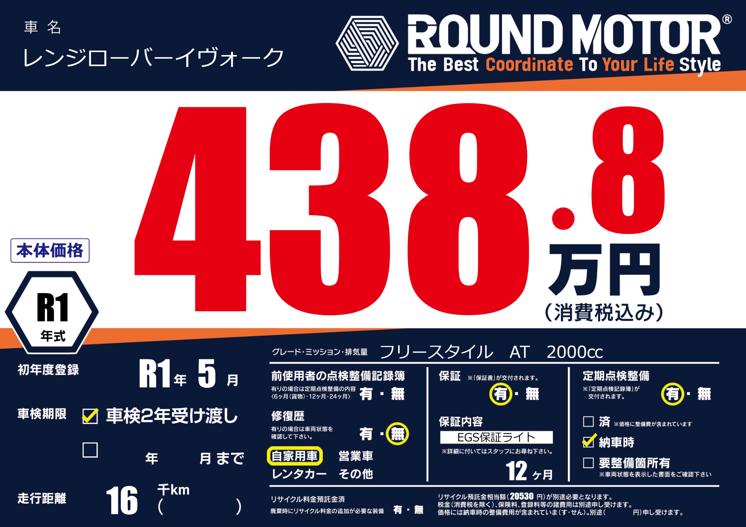 | 車名 | レンジローバーイヴォーク | グレード ミッション 排気量 |