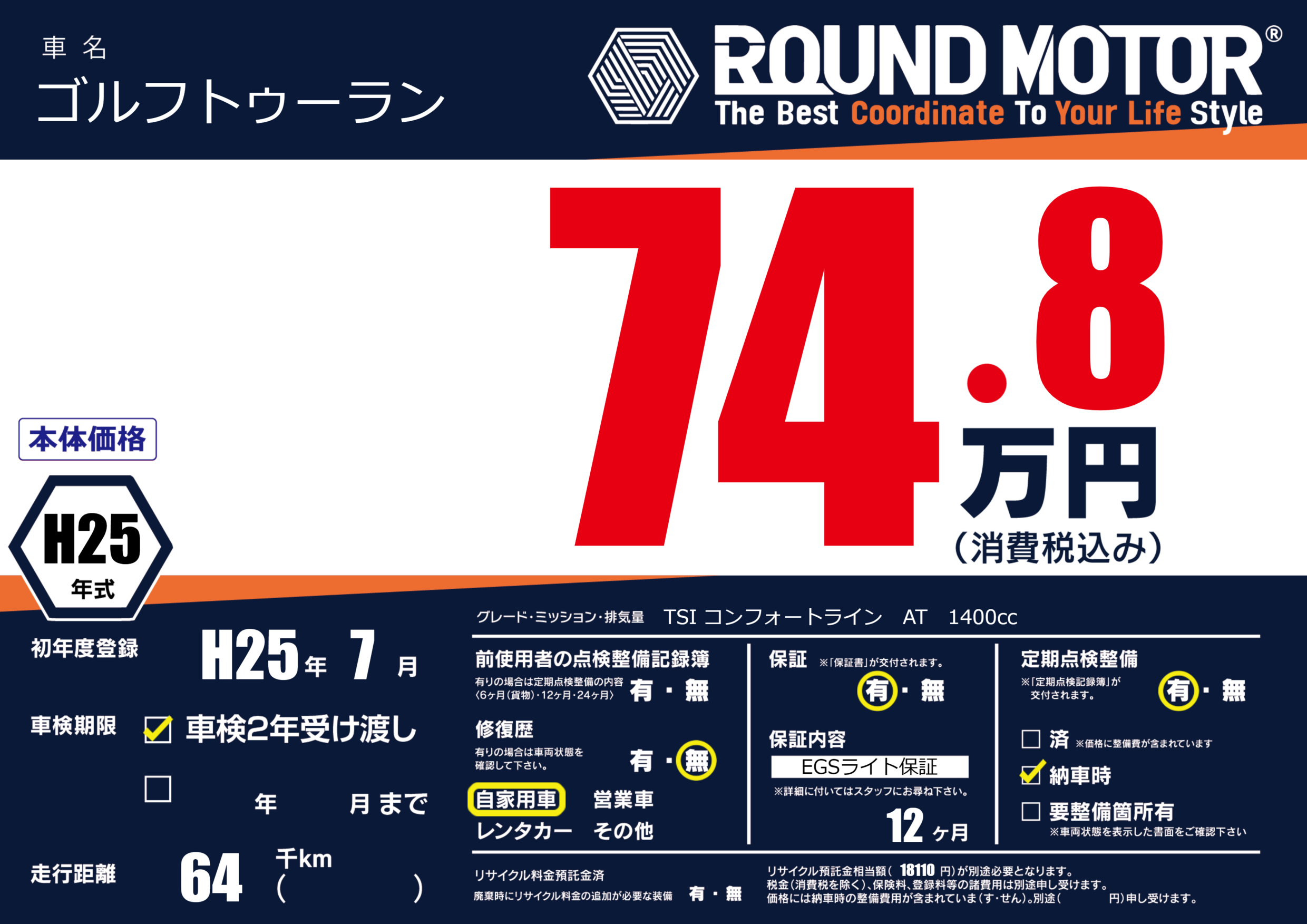 | 走行キロ | 6.4万km | 初年度登録 | H25年7月 |