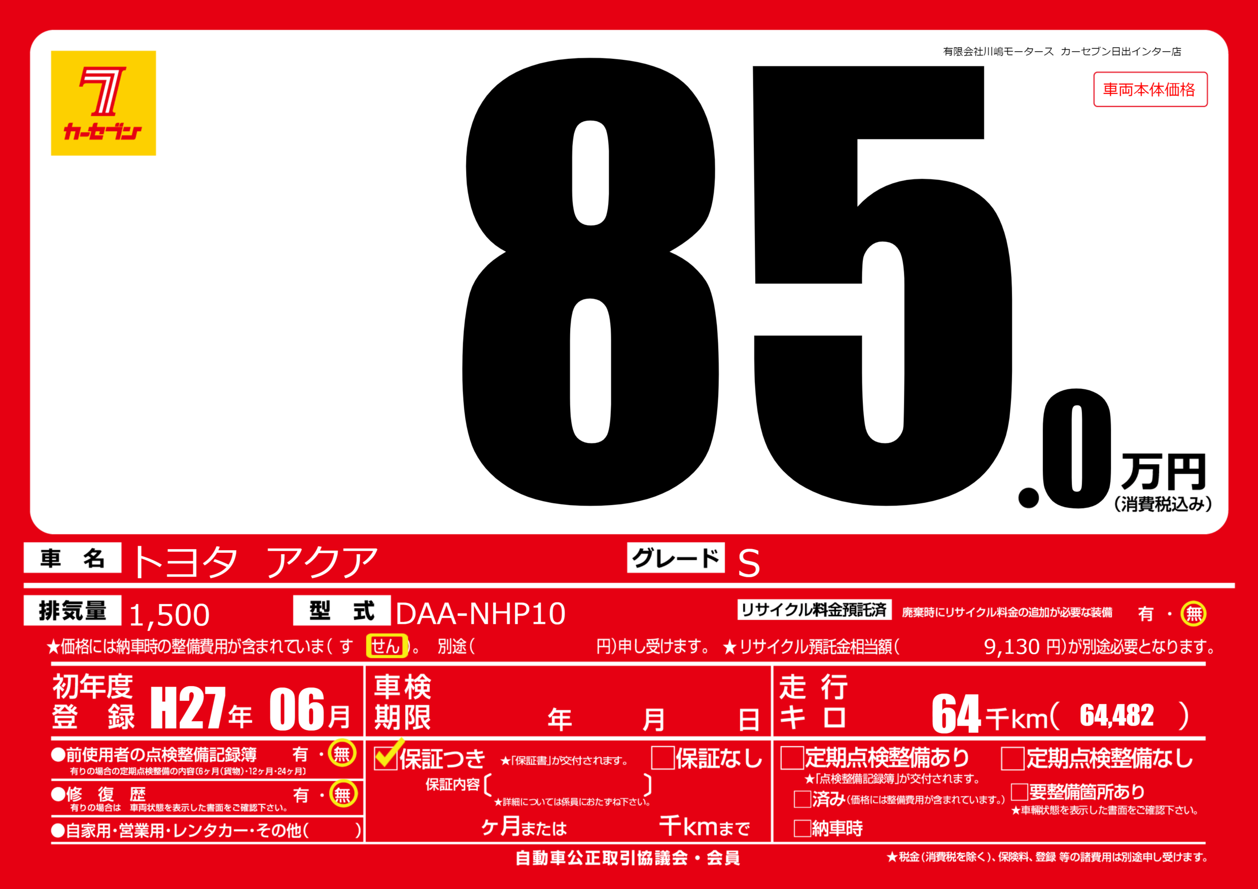 | 車名 | トヨタ アクア | グレード ミッション 排気量 |