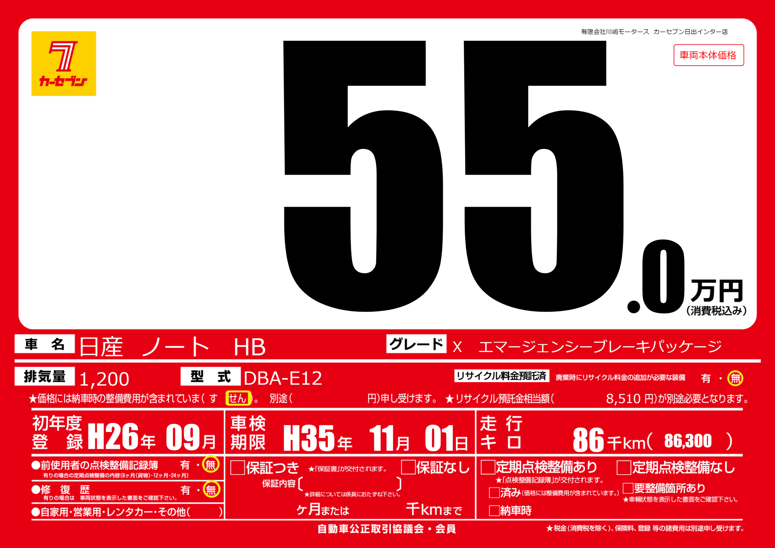 | 車名 | 日産 ノート HB | グレード ミッション 排気量 |