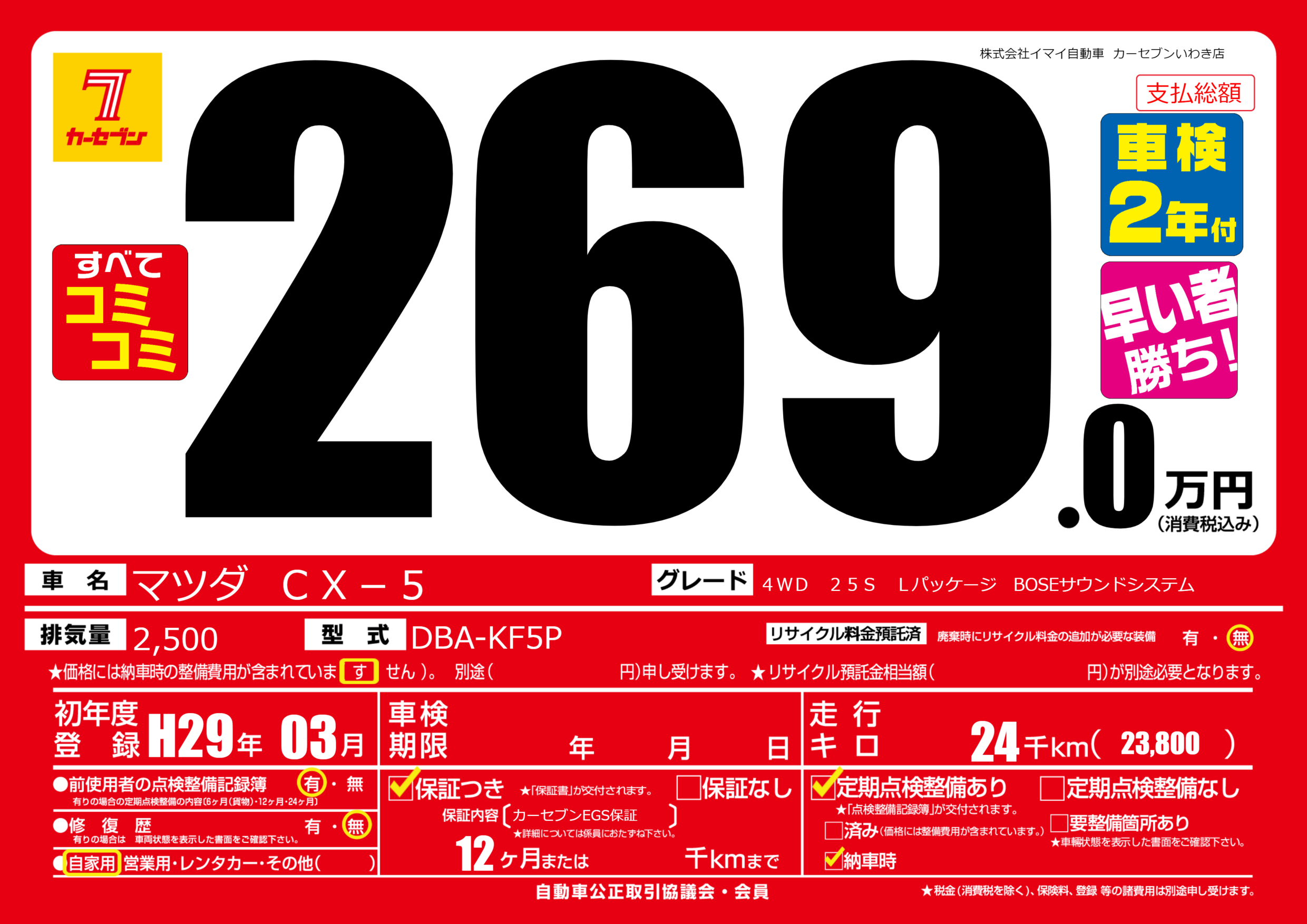 | 車名 | マツダ CX-5 | グレード ミッション 排気量 |