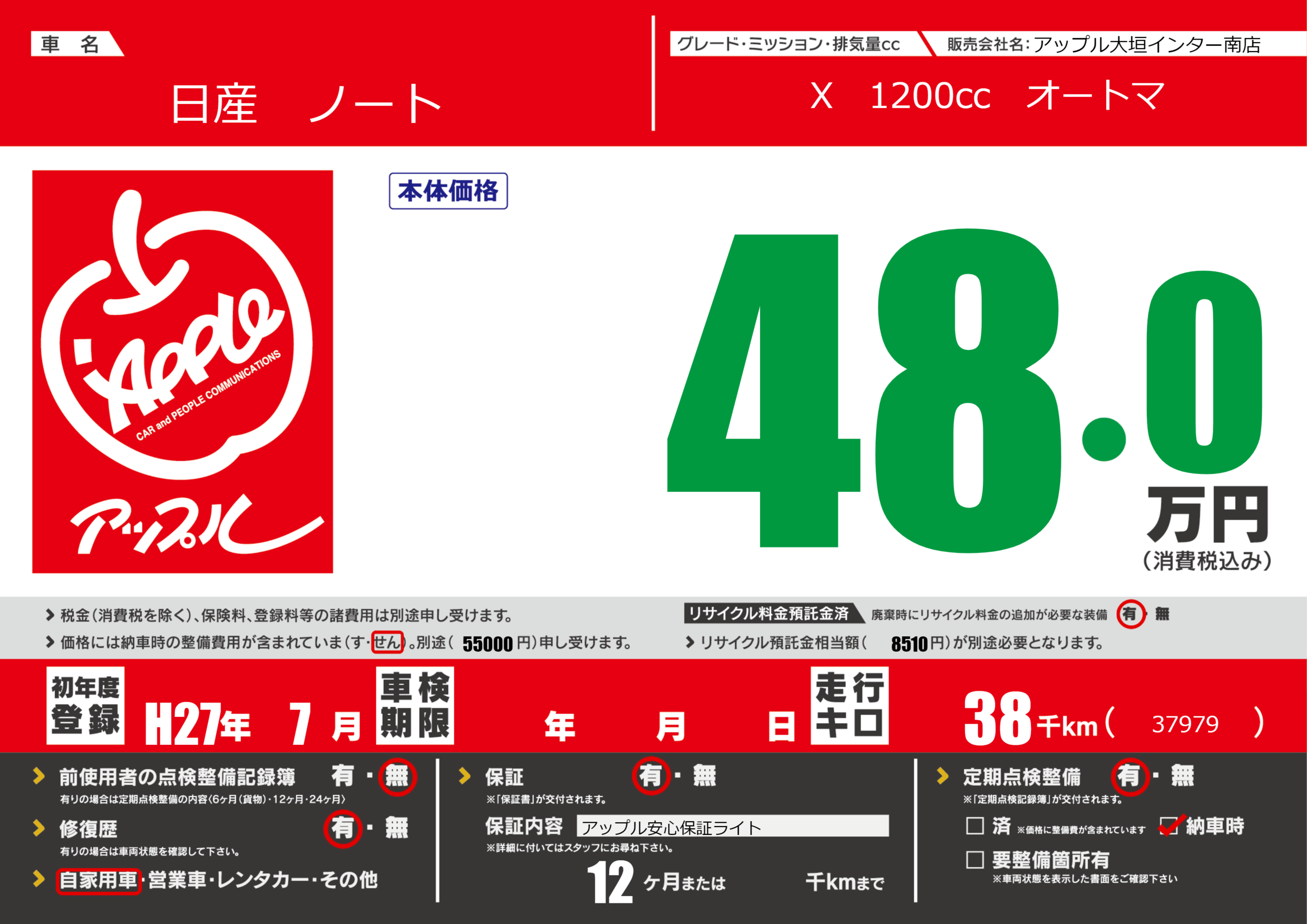 保証付き 保証内容(アップル安心保証ライト) 12ヶ月または()千kmまで |