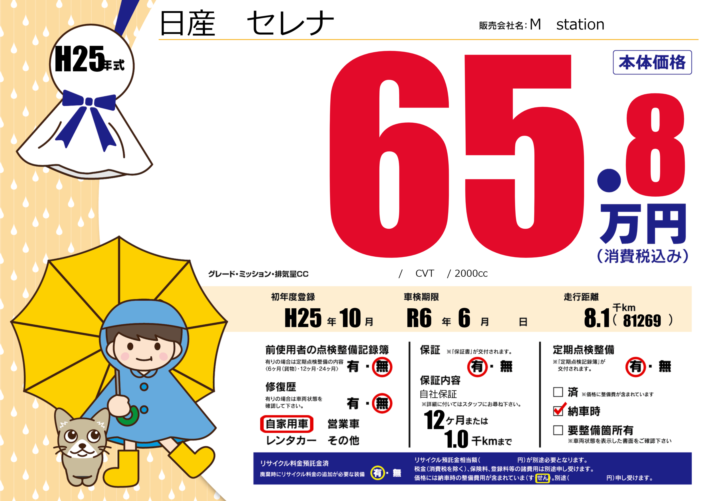 | 走行キロ | 0.8万km | 初年度登録 | H25年10月 |