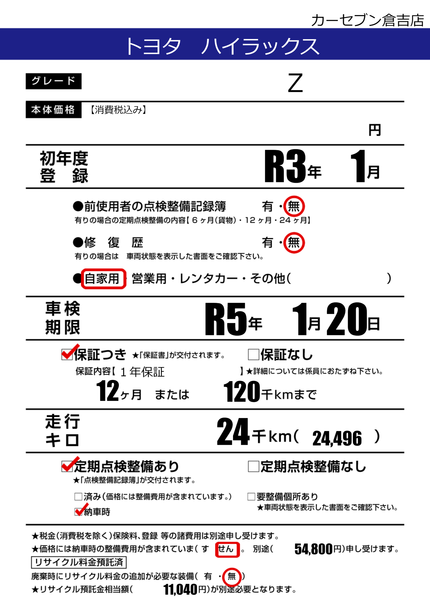 | 車名 | トヨタ ハイラックス | グレード ミッション 排気量 |