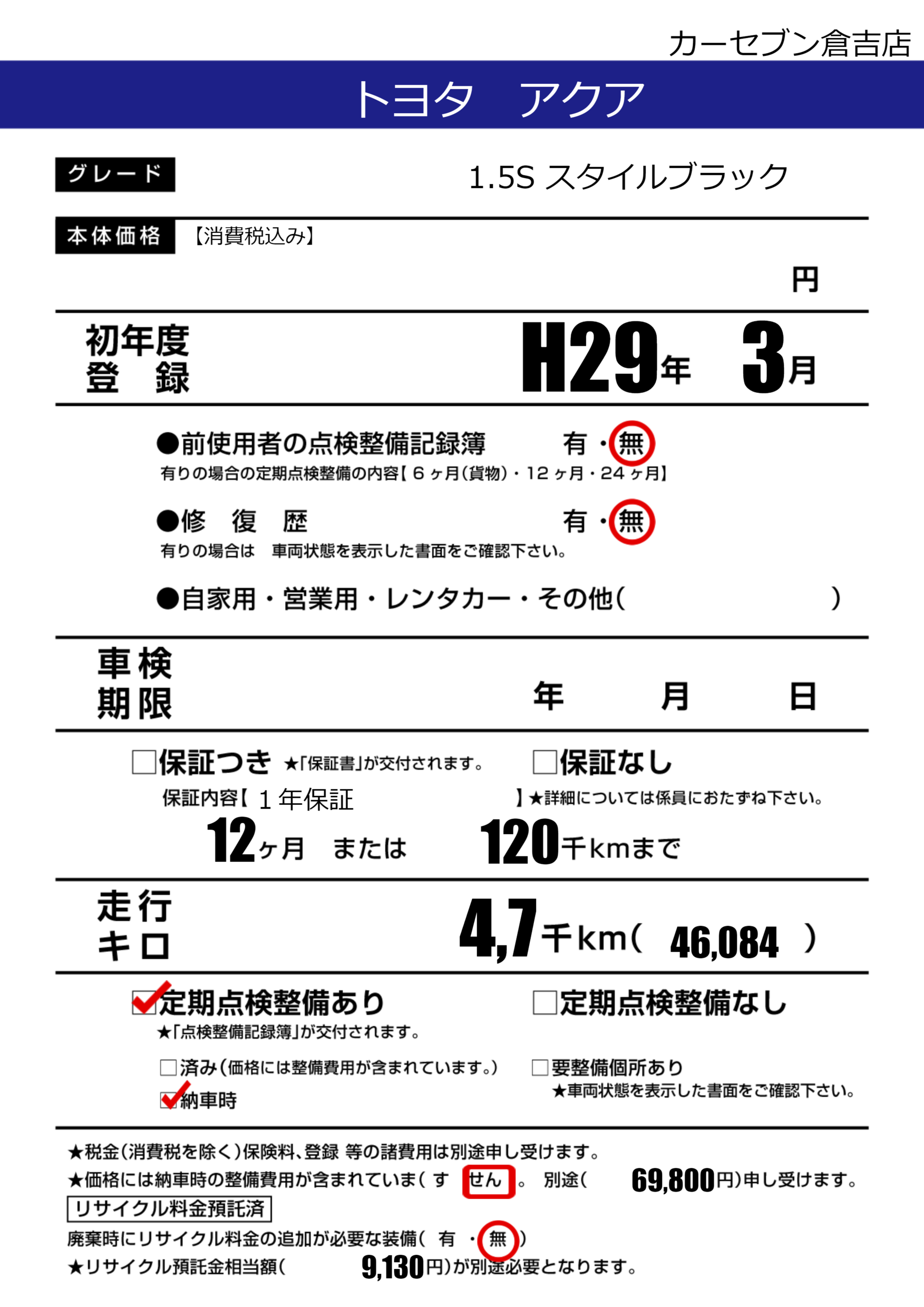 | 車名 | トヨタ アクア | グレード ミッション 排気量 |