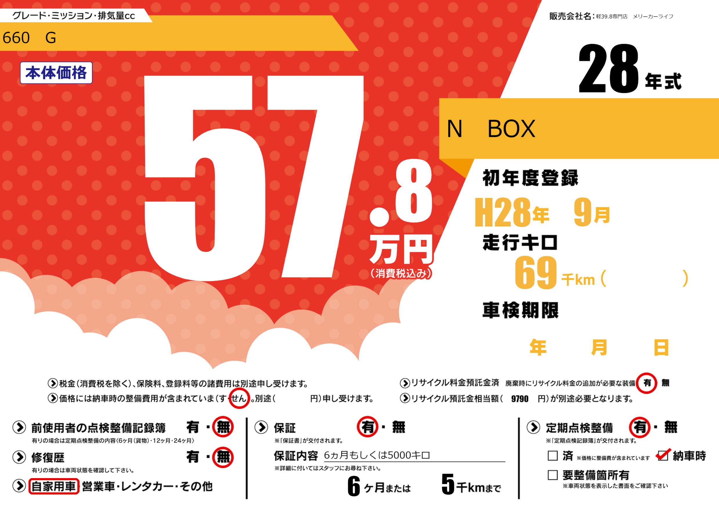 | 車名 | N BOX | グレード ミッション 排気量 |