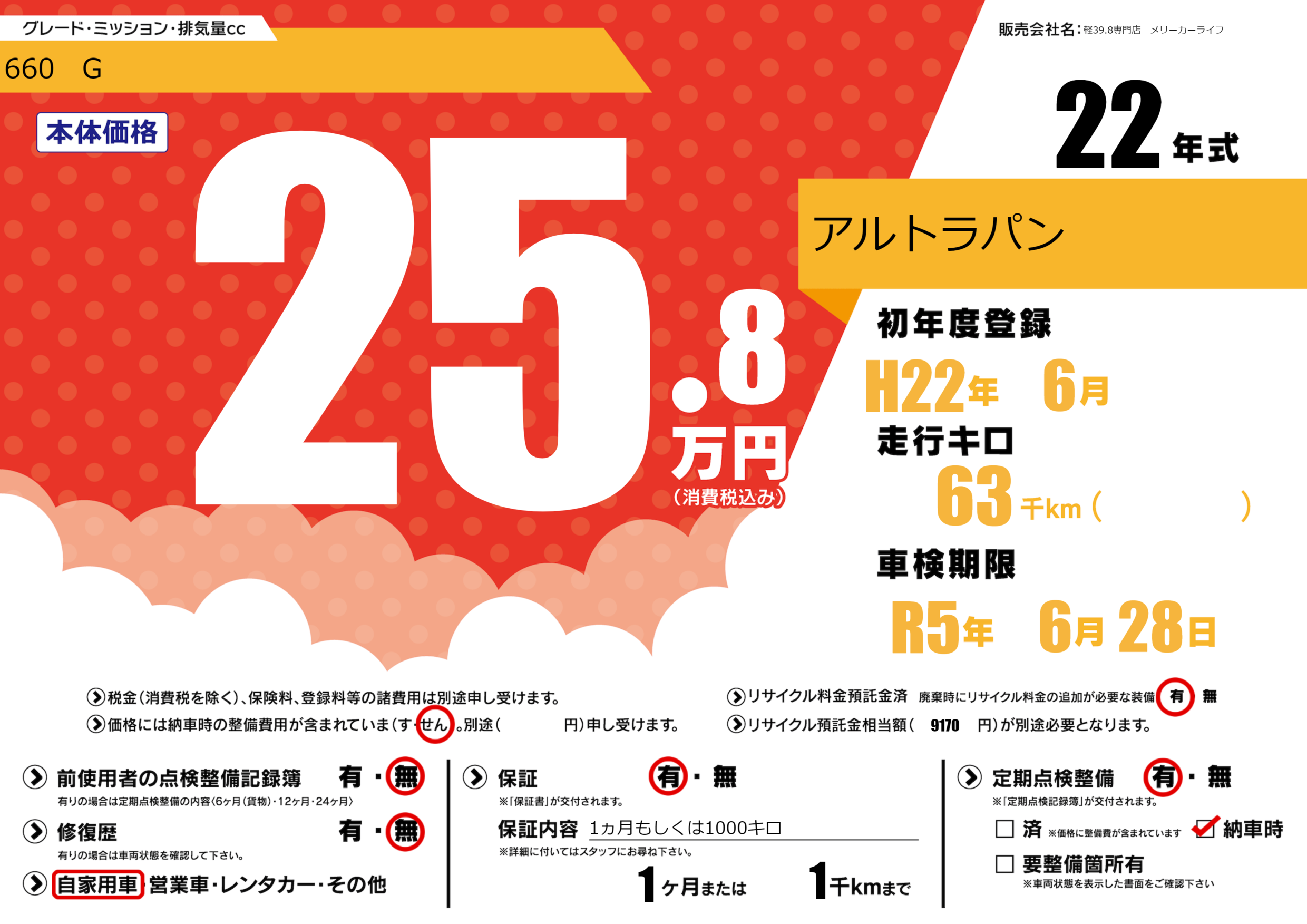 | 定期点検整備 | 定期点検整備あり 納車時あり | ||