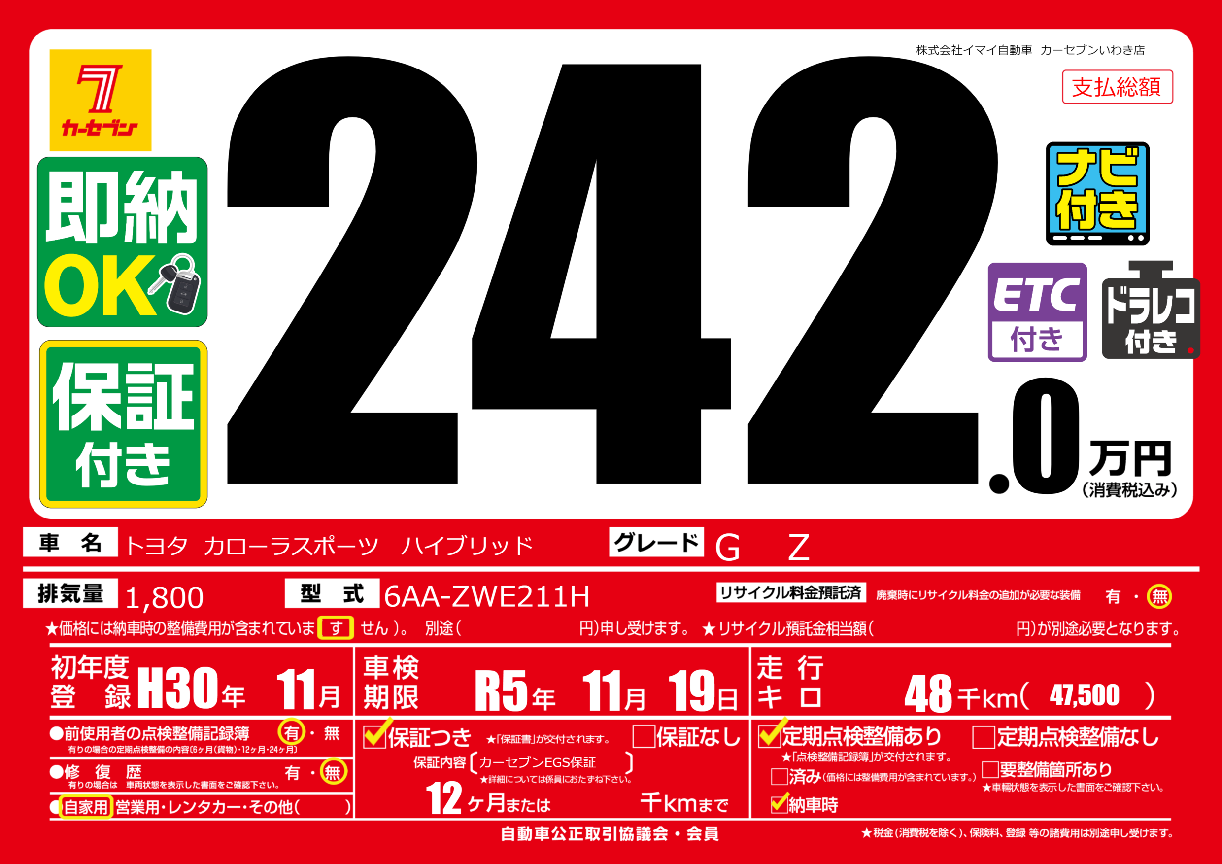 | 車名 | トヨタ カローラスポーツ ハイブリッド | グレード ミッション 排気量 |