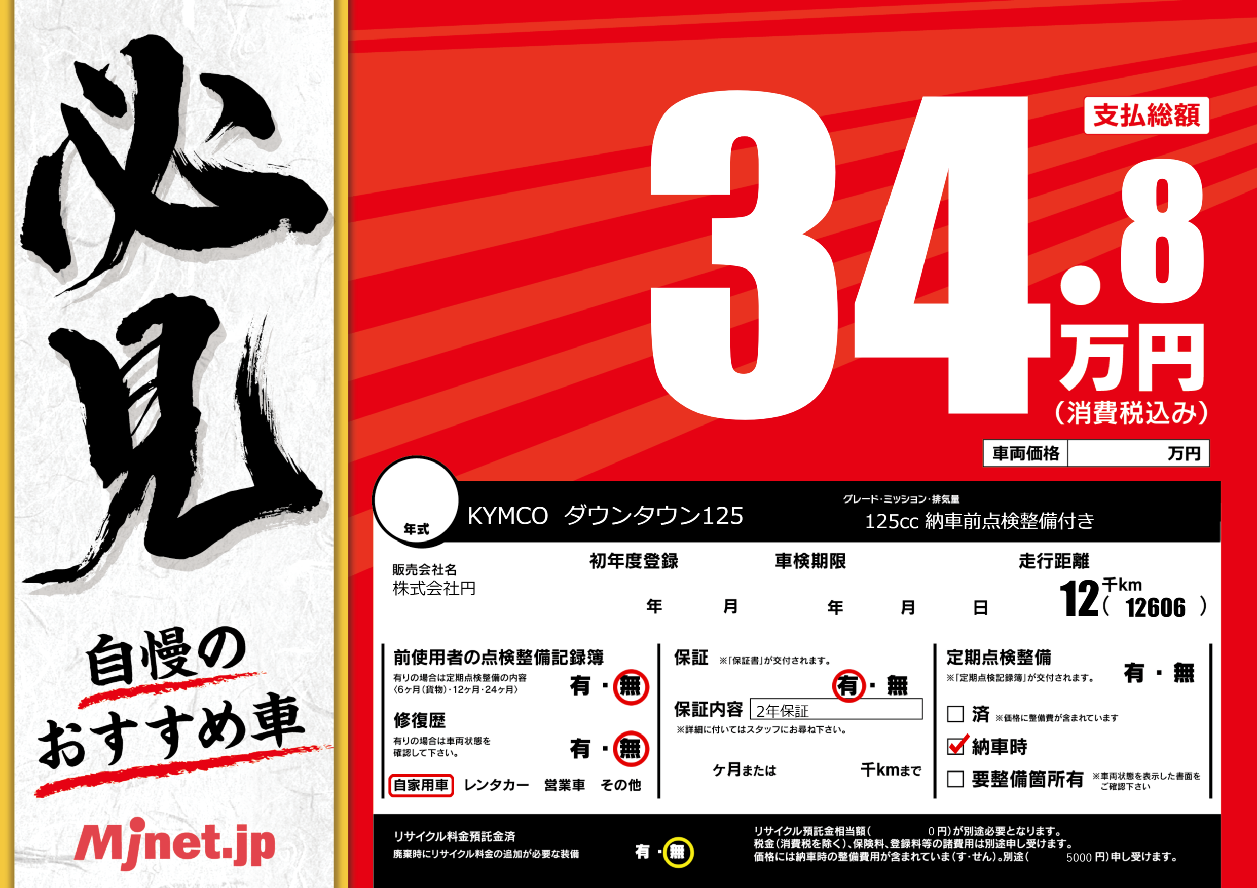 保証付き 保証内容(2年保証) ---ヶ月または()千kmまで |