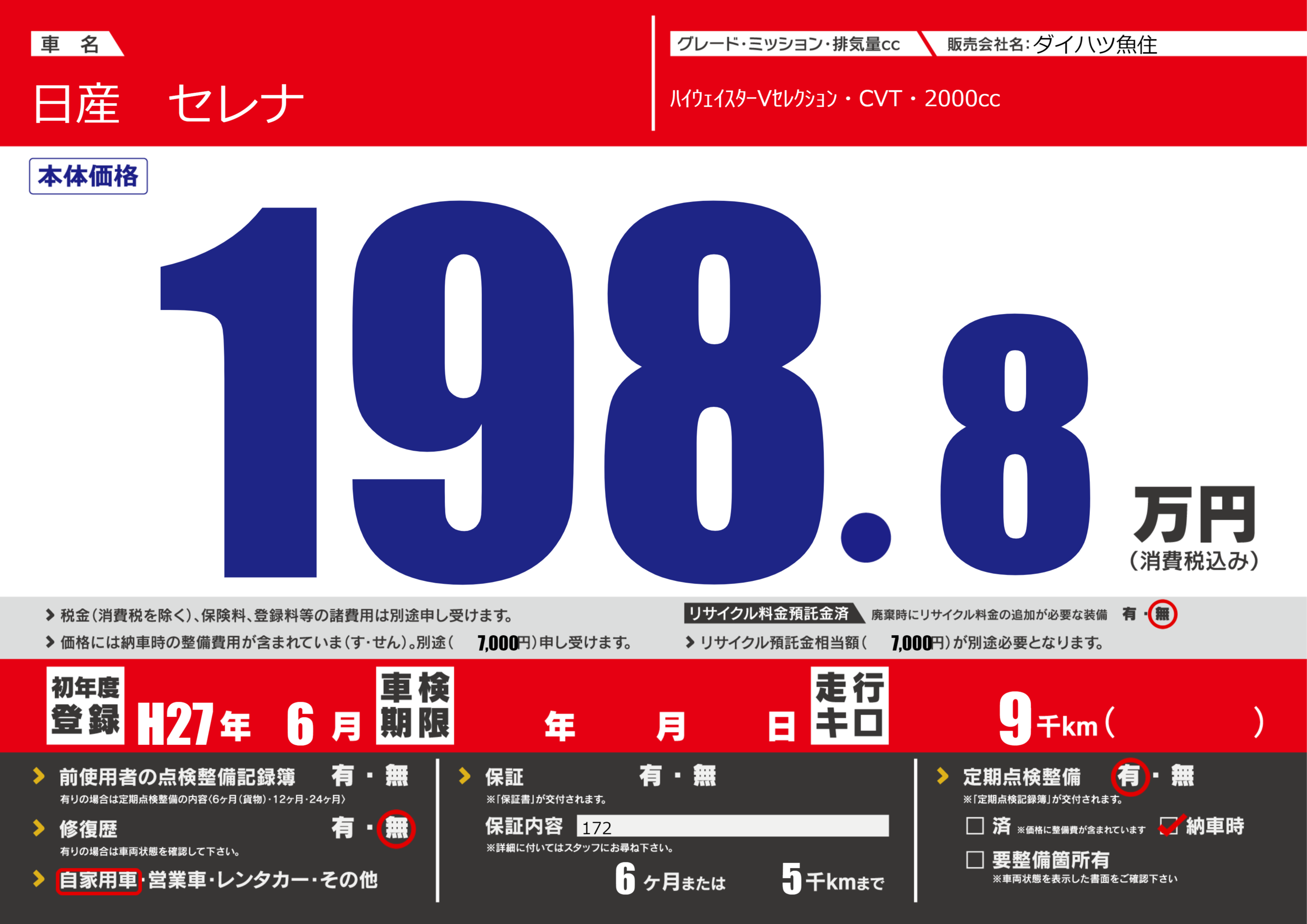 | 車名 | 日産 セレナ | グレード ミッション 排気量 |