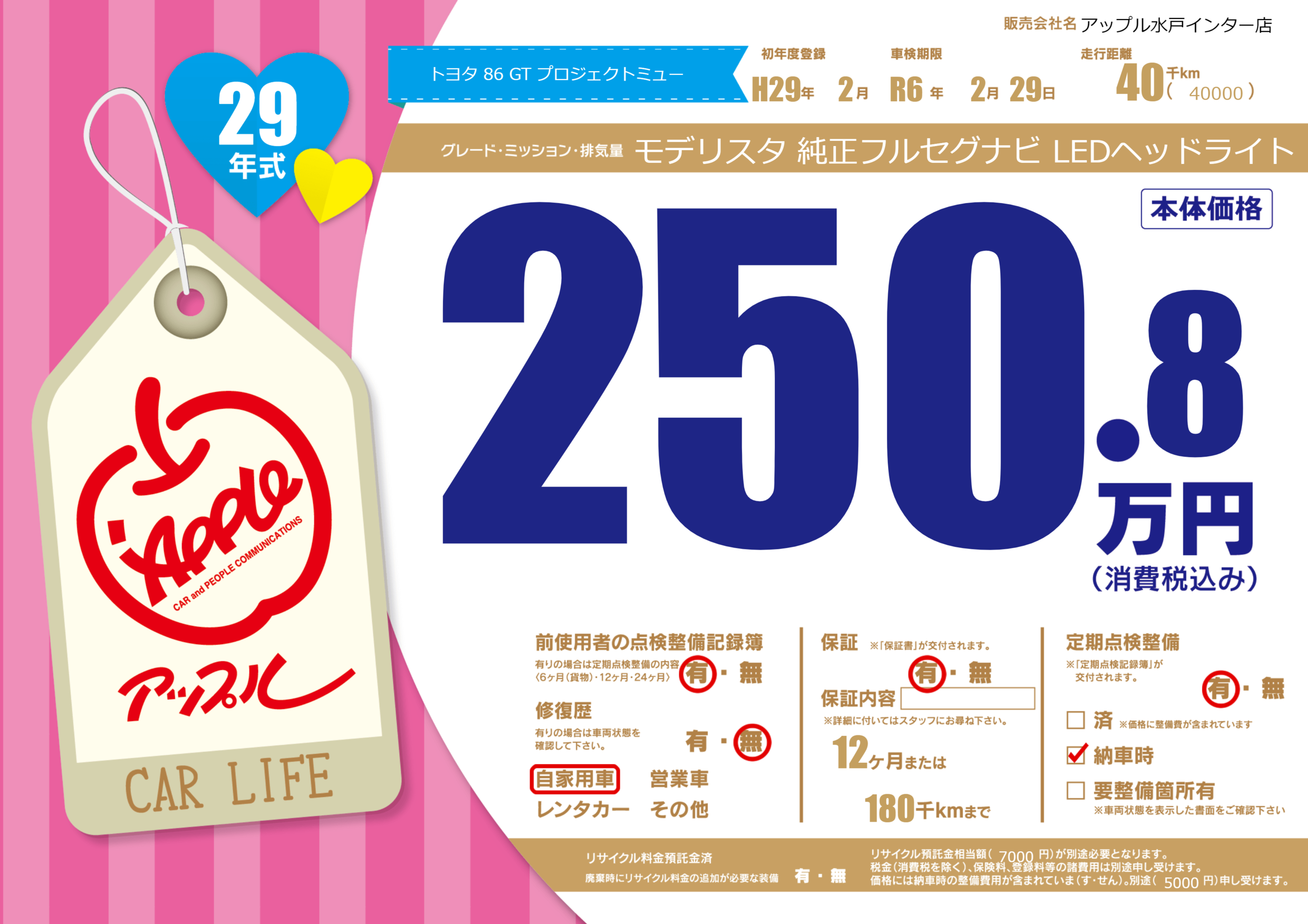 | 車名 | トヨタ 86 GT プロジェクトミュー | グレード ミッション 排気量 |