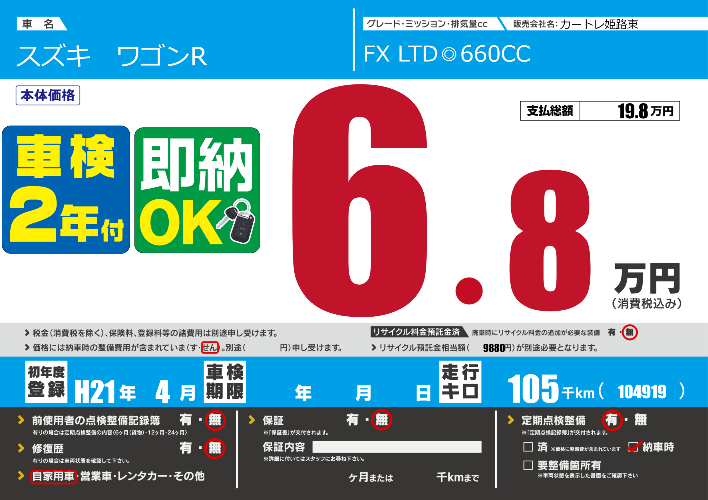 | 定期点検整備 | 定期点検整備あり 納車時あり | ||