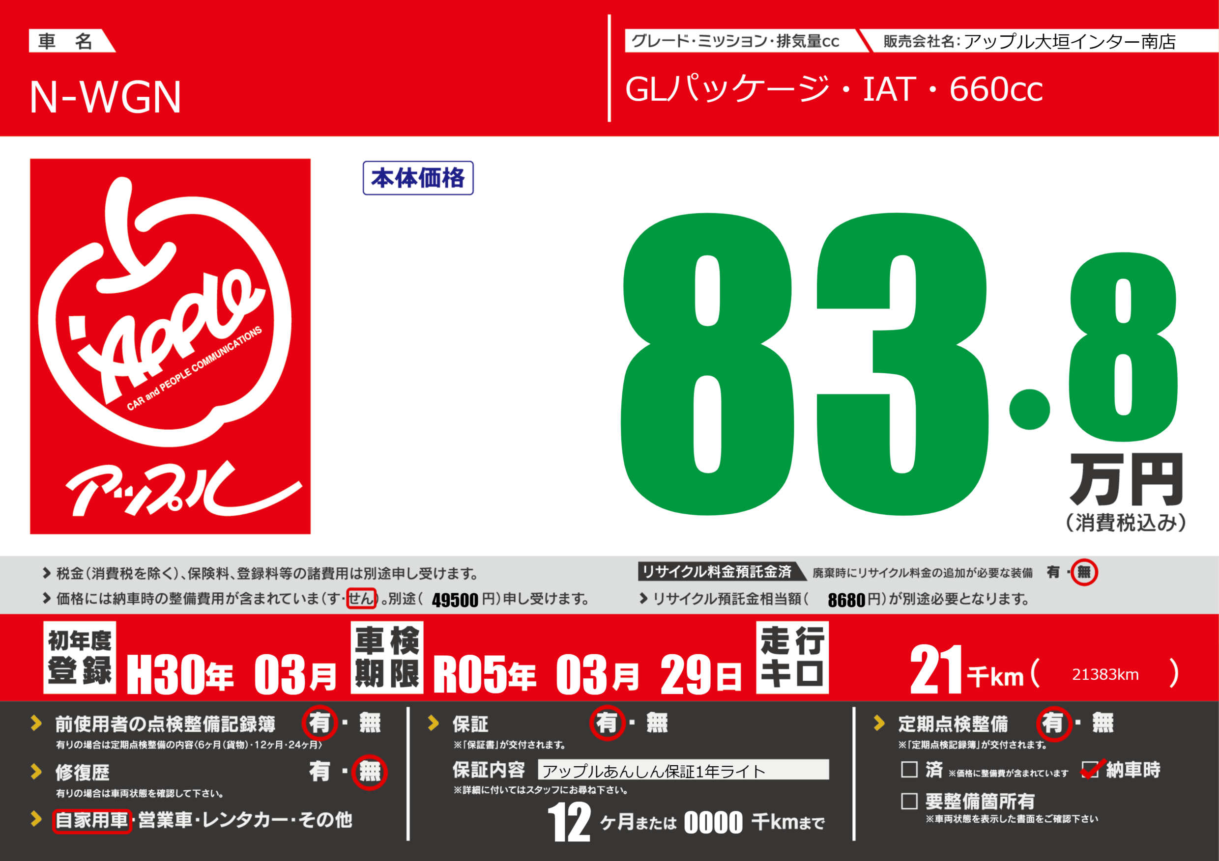 | 定期点検整備 | 定期点検整備あり 納車時あり | ||