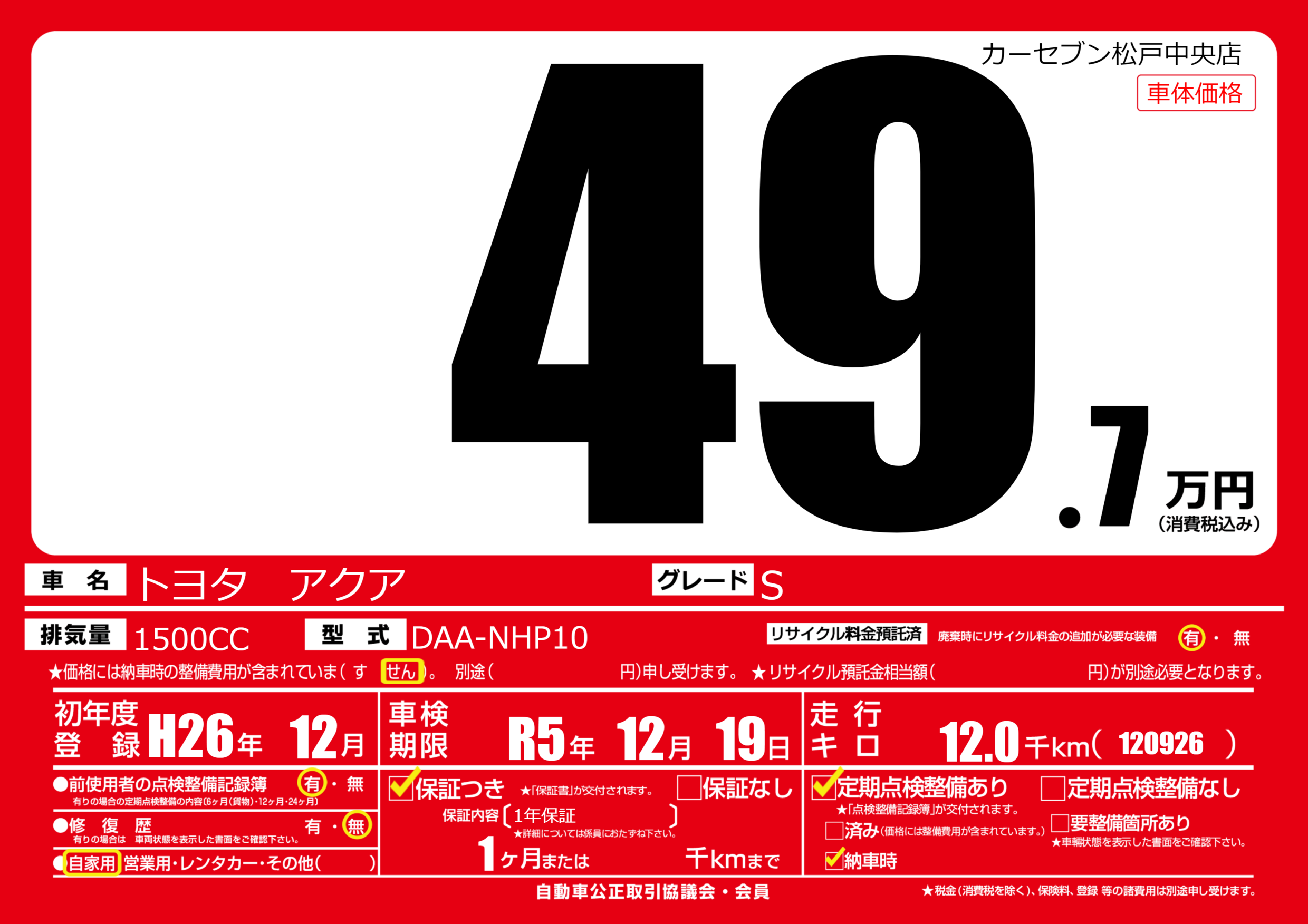 | 車名 | トヨタ アクア | グレード ミッション 排気量 |