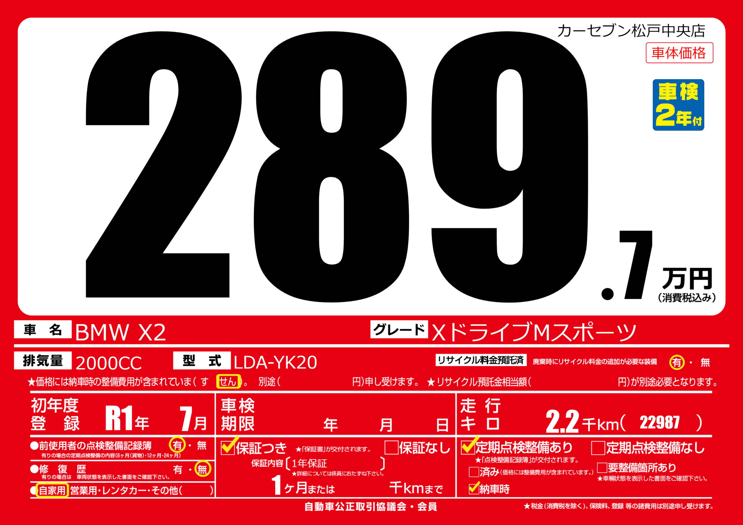 | 車名 | BMW X2 | グレード ミッション 排気量 |